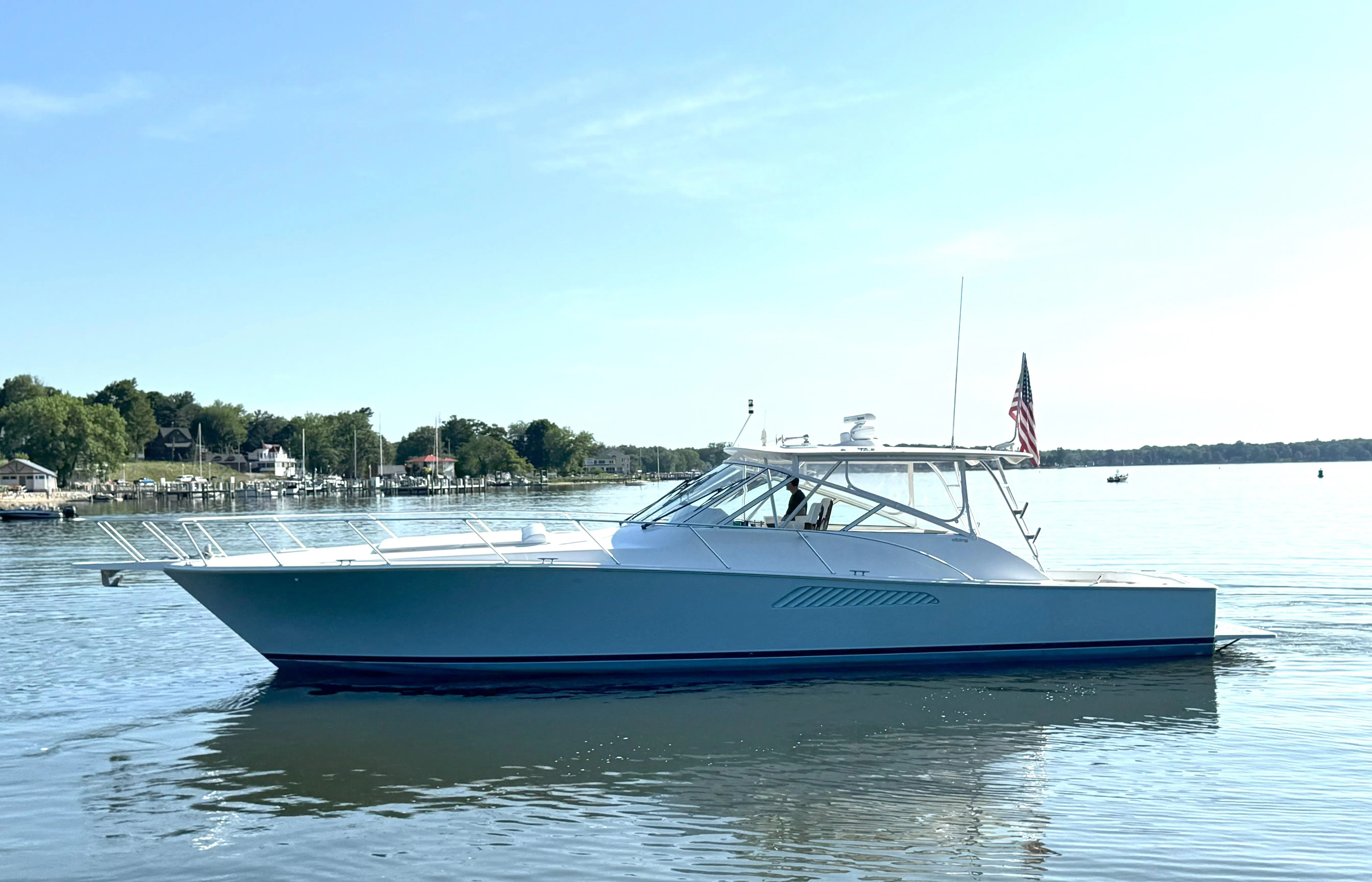 Her express layout provides seamless flow between the cockpit and helm, maximizing functionality and accessibility. The expansive 148 - square foot cockpit is designed for action and comfort featuring aft facing mezzanine, freezer unit, dry storage, refrigerated drink box, transom live well, insole storage or fish boxes and tackle drawers.