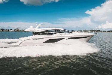 The exterior boasts an expansive cockpit with ample seating and a retractable sunshade, a hydraulic swim platform for easy water access, and a flybridge with a helm station, wet bar, and additional seating. The yacht's sleek, modern design is complemented by high-quality finishes, state-of-the-art navigation and control systems, and climate control throughout for all-weather comfort. Premium audio and entertainment systems, a washer/dryer, wine cooler, and more add to the vessel's luxurious amenities.
