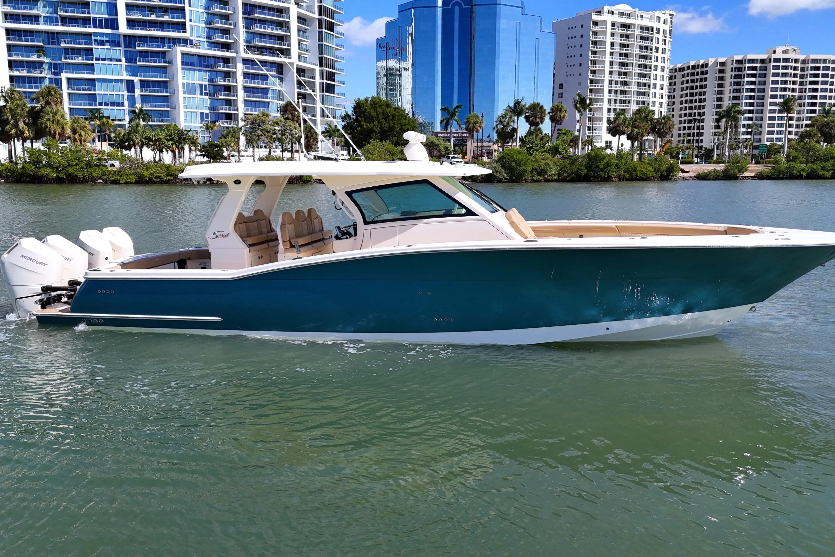 Introducing the stunning 2024 Scout 425 LXF, a remarkable sports fishing boat that embodies performance and luxury, with a custom paint metallic hull and quad 400HP Mercury V10 engines with allowing you to cruise at over 40mph and top speed of 70mph!