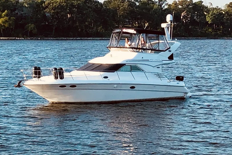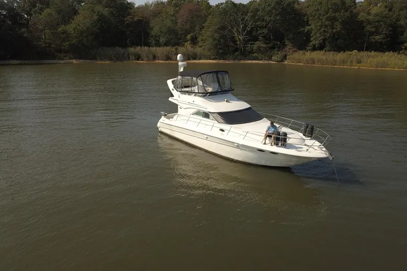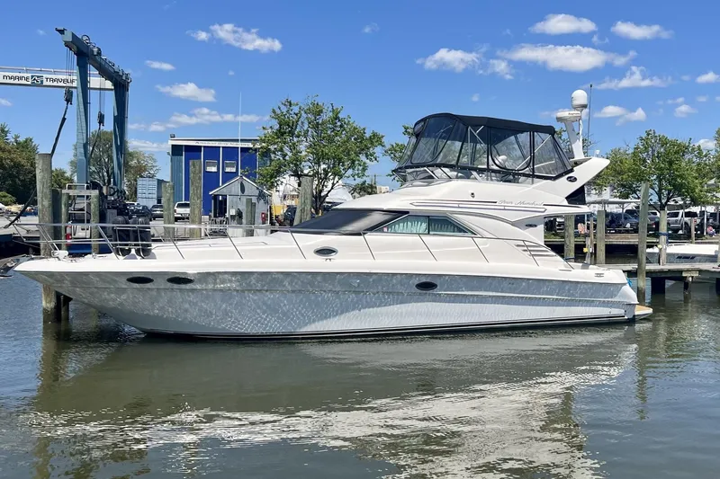 This Sea Ray 400 Sedan Bridge is a beautiful boat and has been well maintained by its current owner with a open check book. It is powered by twin Cummins Diesels 8.3 6CTA's with only 734 hours and a 8 kw Westerbeke Generator. The floorplan has two Staterooms, a mid-level galley, and a more open salon. The cockpit is well shaded by a flybridge overhang, built-in transom seat, molded-in flybridge steps, and transom door. A hatch in the cockpit sole provides access to the engine compartment. Topside, a huge wraparound settee with two helm seats forward. The hull has a wide beam with prop pockets, underwater exhaust and bow thruster. With the twin 450 Horsepower Cummins she will cruise at 26-27 MPH and WOT 32 MPH...