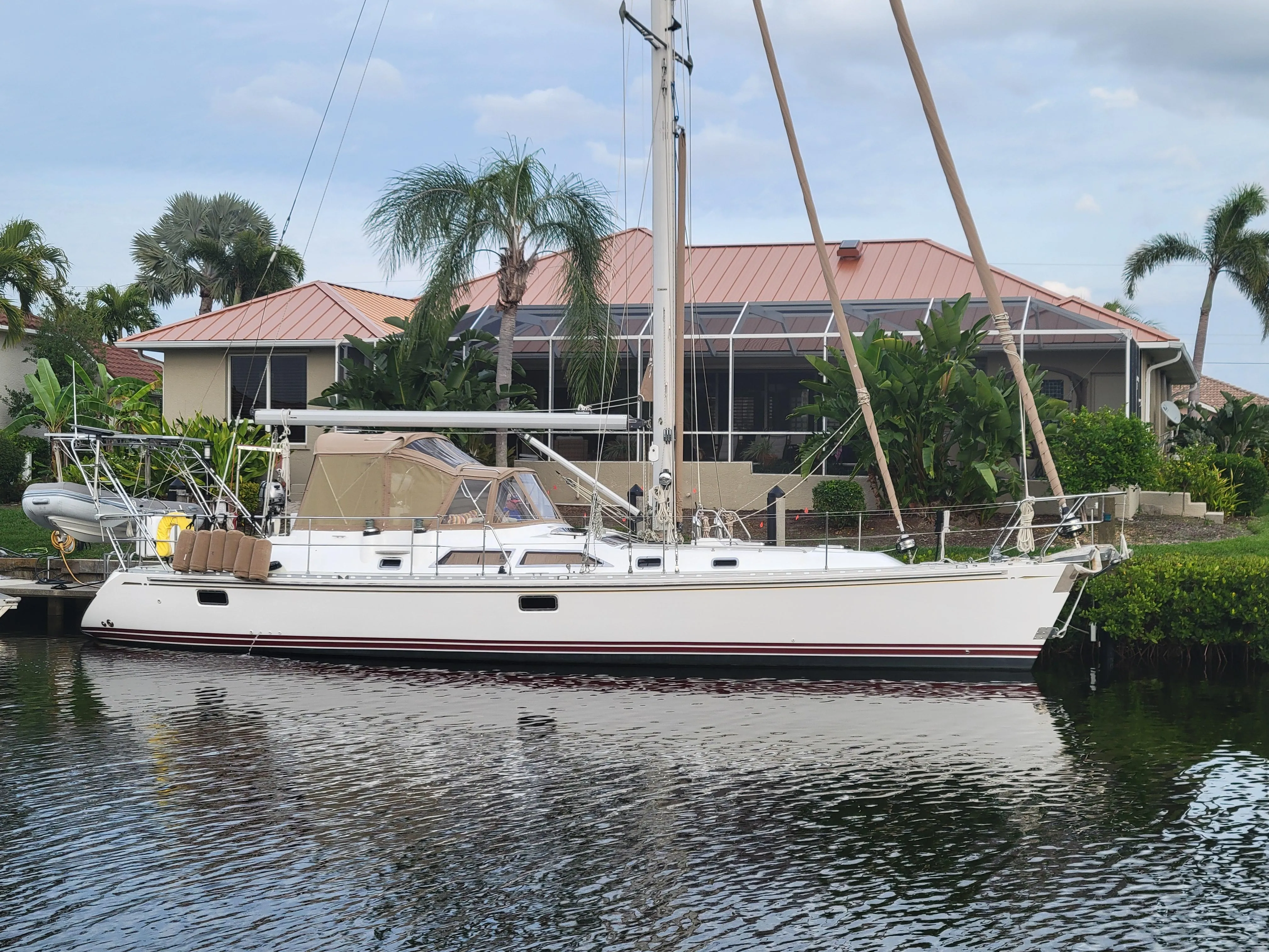 Her interior is in beautiful condition. Bamboo and teak sole raised panel teak lockers and ultra suede leather cushions provide a comfortable attractive surrounding with a touch of luxury. Her low hours, air-conditioning, water maker, generator and in mast furling make for comfortable cruising. The new Rockna 72-pound primary anchor with over 250 feet of new chain and secondary 66 pound Bruce anchor and back up Fortress 23x, extended push-pit keep you safe while cruising. The cockpit dodger, bimini and full enclosure keep you dry and safe in bad weather. The Wells stainless arch with solar panels and dinghy davits add to your cruising comfort and provide the necessary battery charging boost to leave her for long periods of time away from the dock.