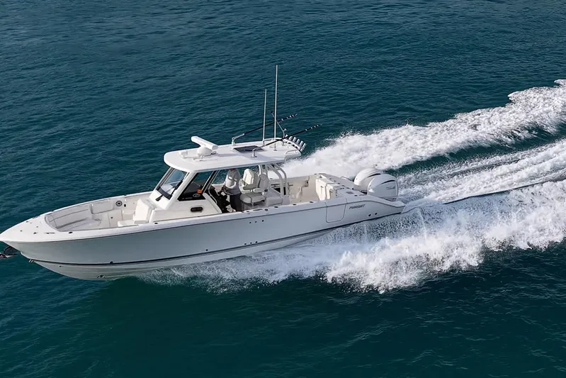 The Pursuit S 328 broadens the range of the Pursuit’s popular Sport Series. The athletic 32 features an oversized fiberglass integrated hardtop and windshield system, updated classic sheerline, through-stem anchor system and integrated transom extensions. The exterior styling is complimented by a forward wrap-around lounge at the bow, just opposite of the forward facing seating in the console.