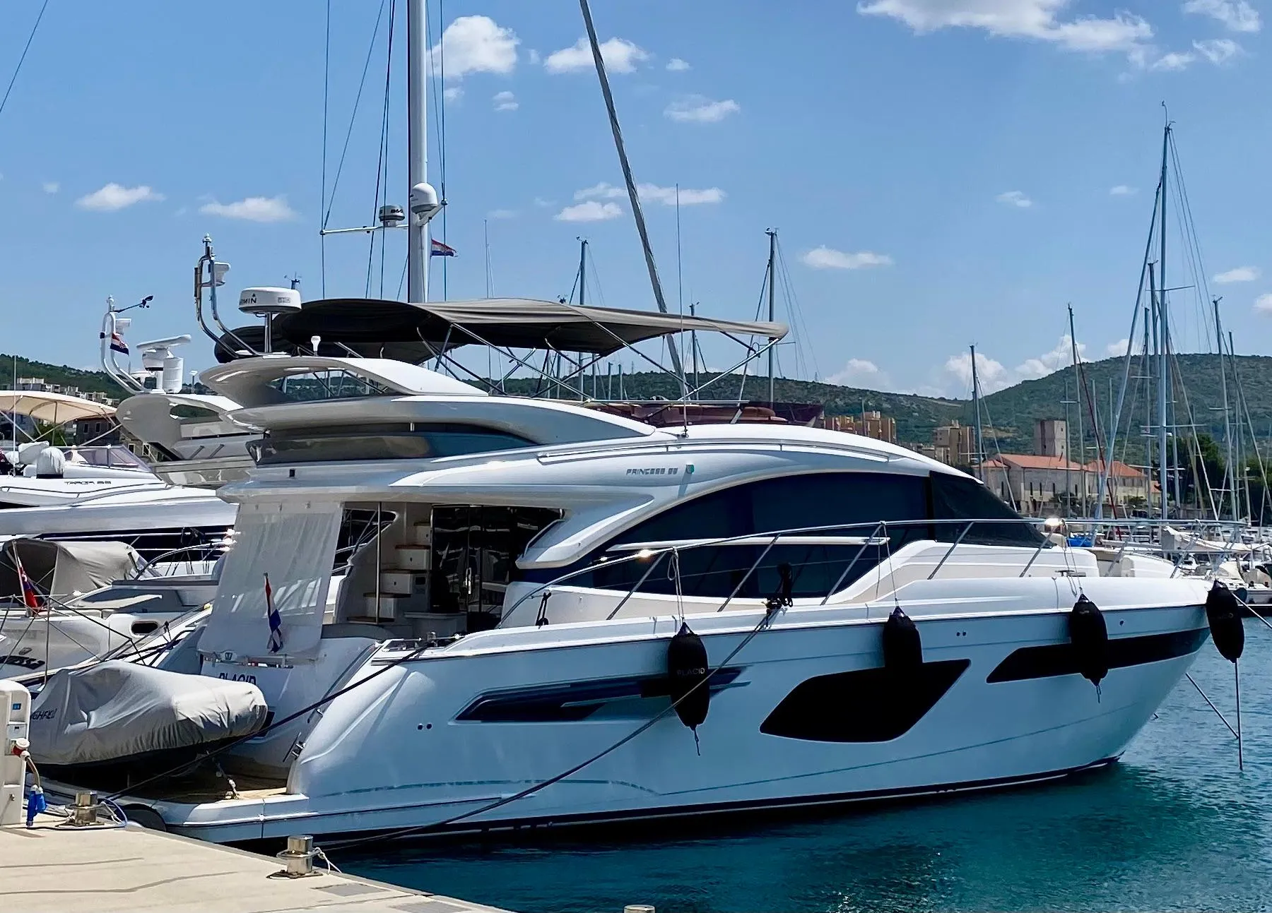 The offered Princess F55 is immediately available at a very competitive price! Fully equipped in excellent condition with all desired options. Stunning interior in light Oak with Timber Flooring in Galley and Saloon. Full Teak Deck, Seakeeper NG9 Gyro Stabilization, 3x Joystick Control, Hydraulic Bathing Platform, Air Conditioning and 17,5 kW Onan Generator. Launched in 2019 and approx. 573 engine hours only. In 2023 new high-speed Antifouling, Propspeed, new Service and Engine Batteries as well as 2,5 kW Inverter for all sockets and Remote for aft Platform, Watermaker Eco 200 l/h, Highfield CL 340 Hypelon + Honda 20HP