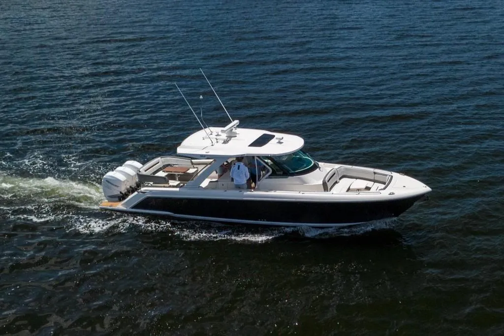 Pogue Life, a 2021 Tiara 38 LS, redefines luxury sport yachting. She offers exceptional functionality with walk-around access and lounge seating accessible from both port and starboard, and an island-style outdoor galley, setting a new standard in the luxury sport yachting segment.
