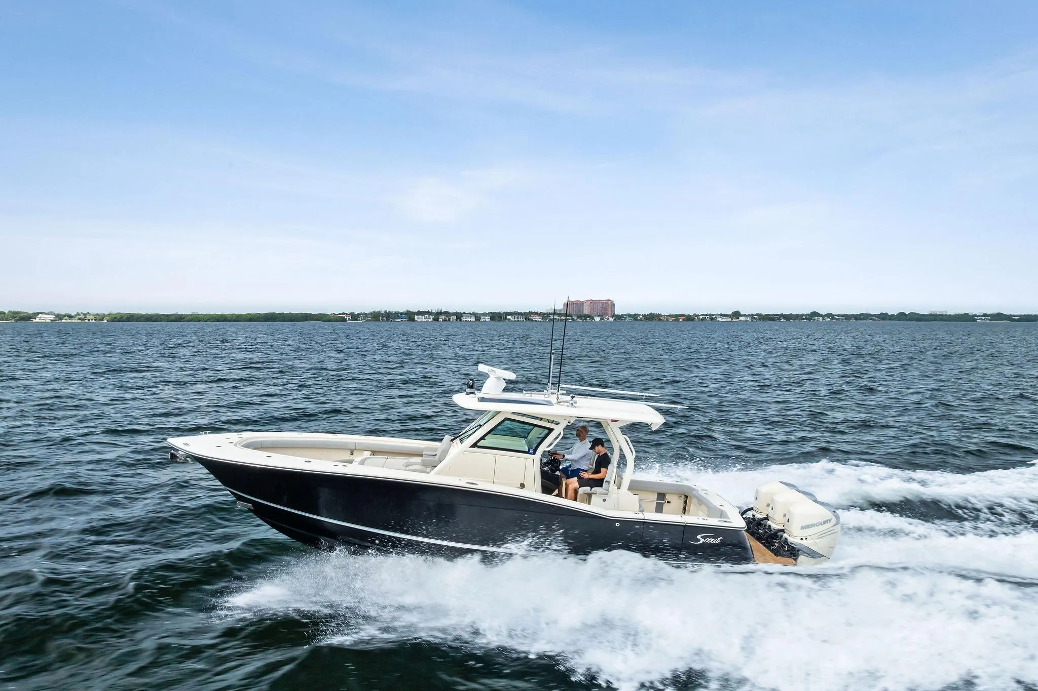 Built on Scout’s epoxy-infused, dual-stepped modified deep-V hull, Prime Tyme offers an efficient, dry ride with confident handling. Mercury SmartCraft DTS with Skyhook joystick, a Lewmar bow thruster, Lectrotab trim tabs, and custom-painted engines make close-quarters work simple, while a Seakeeper 3 gyro adds impressive stability at rest. Robust DC and AC systems, dual 30-amp shore power, multiple chargers, and T-top solar panels support extended time aboard.