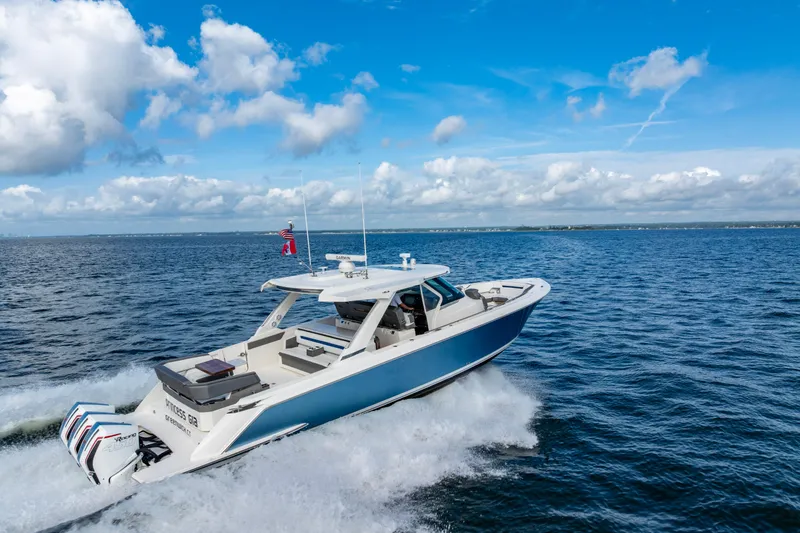 The sleek styling of the 43 LS is best complemented by power and performance. Mercury power combined with glass cockpit integrated electronics including Garmin® Marine navigation systems provide comfort and control at the helm.  Helm master joystick steering offers an additional level of command at the dock or underway. A fuel capacity of 400 gallons combined with a top speed over 50 mph gets you to your favorite port of call fast, giving you more time to enjoy with family and friends.