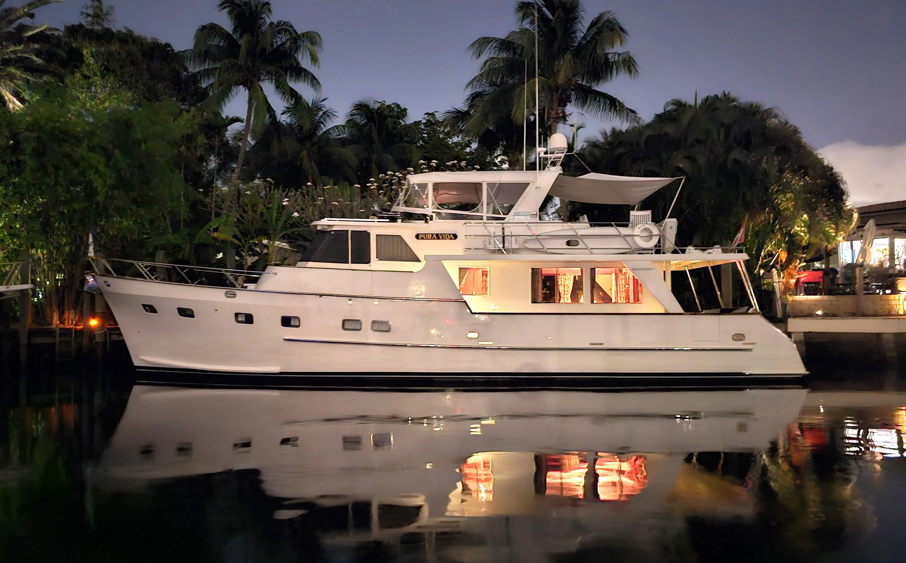 PURA VIDA is absolutely sensational both inside and out. This yacht features a 3 cabin, 2 full head layout with an on deck day head and full-size galley. Plan on comfortable cruising from reliable twin Caterpillar diesels and Naiad stabilizers, bow thruster and aft docking controller.
