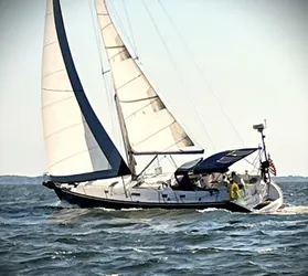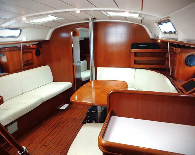 The Beneteau 411, designed by the renowned Groupe Finot, exemplifies a true marriage of performance and beauty. With the bulb / fin keel, maximum stability and efficiency on all points of sail are achieved by her low center of gravity. The standard in-mast furling main and roller furling genoa provide efficiency and true ease of handling. The large cockpit with teak inlay seats is designed for maximum comfort and the pedestal console allows ample space to install electronics. There is also a dual-leaf cockpit table containing a large molded storage area and plenty of space to stow gear in the large cockpit lockers. The extra-wide aft swim platform and ladder, walk-through transom, and standard cockpit shower makes swimming easy and convenient. Both the two- and three-cabin layouts have roomy companionways, large cabins, and plenty of storage throughout, all accented with richly detailed cabinetry. Specially designed for serious cruising, the 411 nav station has a large chart table with additional locker storage underneath, as well as ample space for installing electronics. The deluxe forward owner's stateroom features a generous double berth and an upholstered port settee that is perfect for reading or relaxing. There is also private access to the spacious forward head with sink and shower unit. The galley is beautifully appointed with pressure laminate countertops, double stainless sinks, and loads of storage. The two-compartment refrigerator / freezer has top and side access, and the two-burner propane stove with oven will accommodate every culinary need.