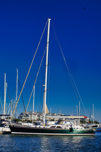 The deck is constructed of hand-laid laminates with a ¾ inch end-grain balsa core. In areas of high stress, such as where deck fittings are taking compressive or tensile forces, the deck is solid fiberglass. The hull to deck joint is both chemically bonded with 3M 5200 and mechanically fastened with stainless steel through bolts.