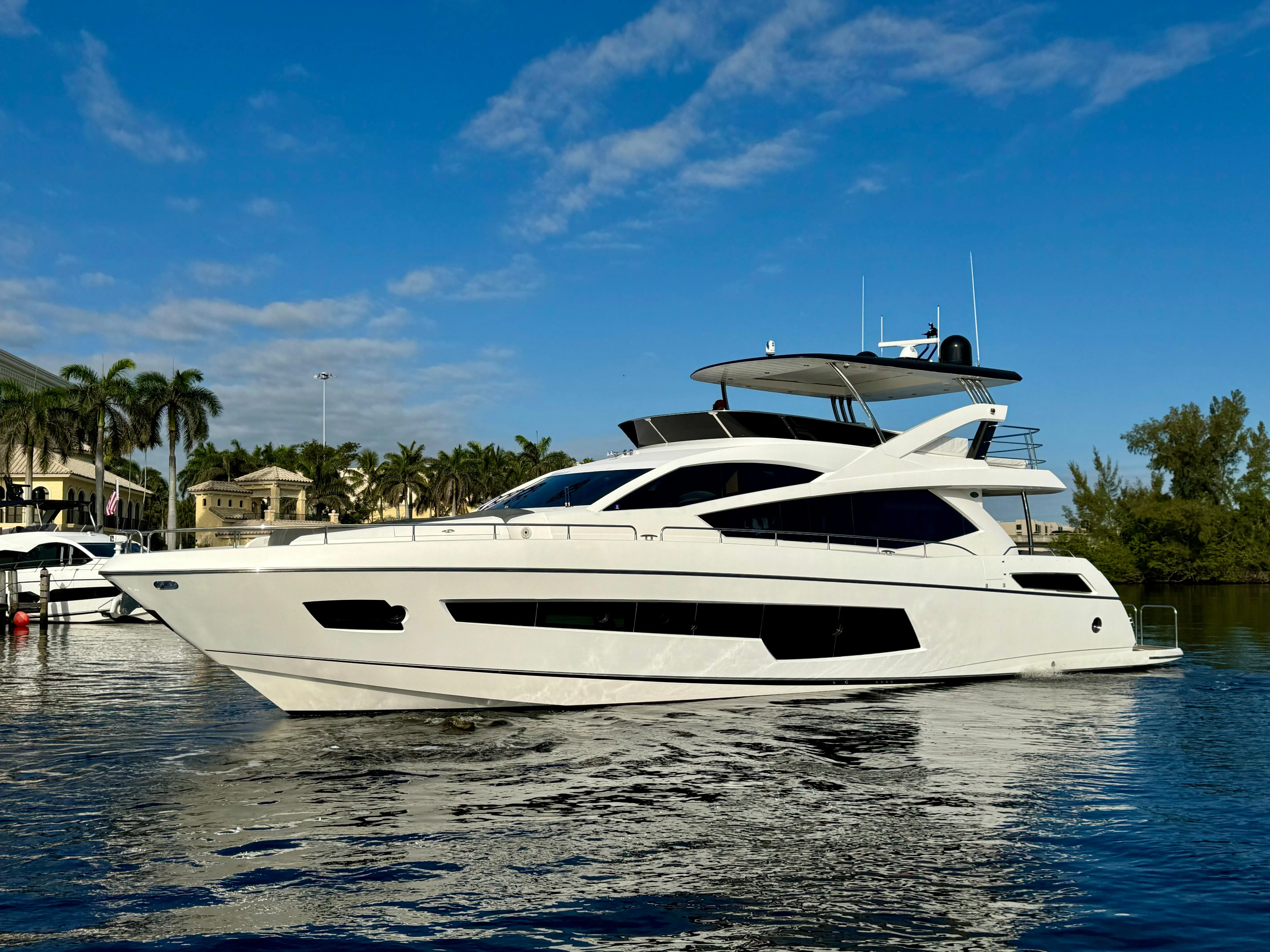 2016 Sunseeker 75 Yacht features a 4 stateroom, 4 head layout. She runs on twin MAN V12 1550 HP engines that can achieve a 31kt top end. Her spacious master stateroom features panoramic windows with opening ports, a king berth, ensuite head, and walk-in closet. Her salon features a large U-shaped settee, sofa, and flush stainless steel glazed sliding door to aft cockpit. Externally, her hardtop flybridge is complete with a retractable sunroof, and a wet bar with Vitrofridge ice maker, Waeco refrigerator, cool box, and Kenyon electric grill.