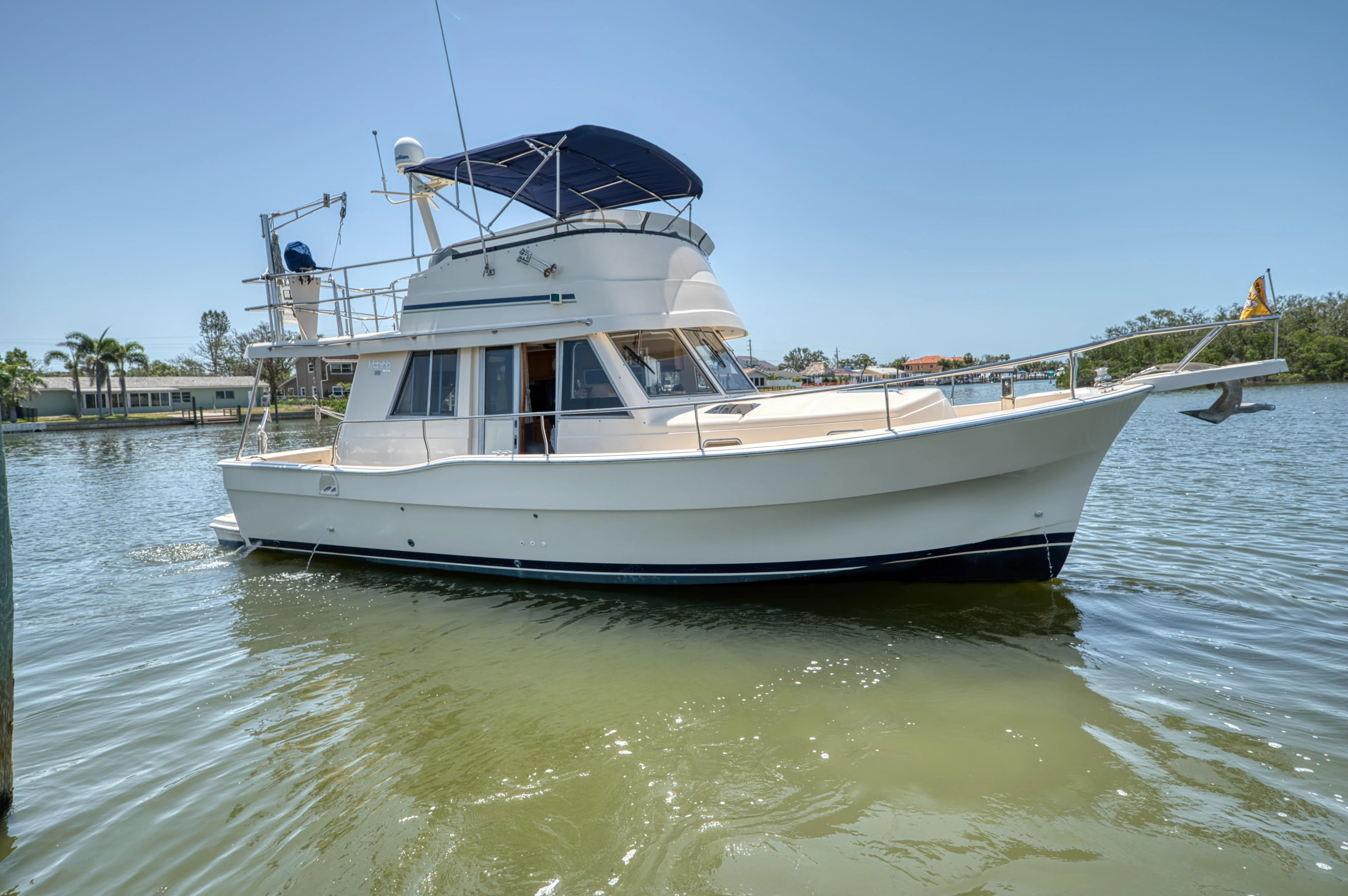 2004 Mainship 390 Trawler "Recess" (South Pasadena, FL) A HUGE success for the Mainship 390 Trawler is an economical, low maintenance coastal cruiser with classic trawler lines and great turn on speed. Considered by many in the yachting community as a "performance trawler," the Mainship 390 rides on a semi-displacement hull capable of higher cruising speeds than a full displacement trawler. Stepping inside from the covered aft deck large wraparound widows provides lots of natural lighting in the salon and excellent visibility from the lower helm. A sofa and hi-low table are starboard in the salon, and a L-shaped galley with refrigerator / freezer and Corian counter is forward to port. The carpeted salon provides easy deck access. There are two staterooms and a single head forward. The master stateroom has an island queen berth and two hanging lockers, and the guest stateroom has two single berths. Molded steps ascend from the aft deck to the Mainship's large flybridge. This single 370hp Yanmar diesel will cruise at 8-9 knots. Bow and stern thrusters make docking easy.