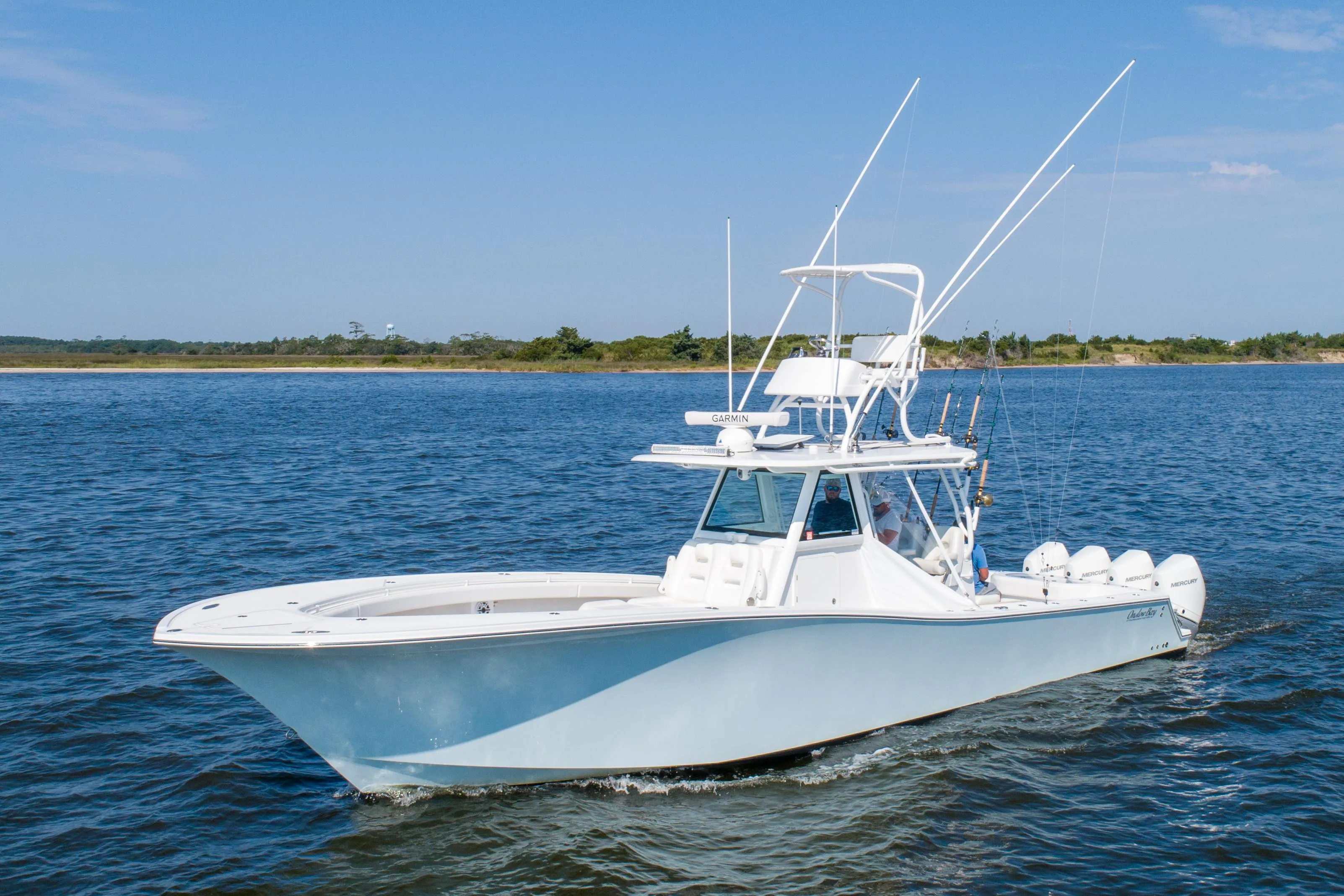 Don't miss out on this like new Onslow Bay 41 Tournament Edition. This is the new style layout providing an enlarged cockpit space and improved performance. She's powered with quad 300 V8 Mercury's that have ONLY 200 hours and warranty till 11/17/2026 that can be extended. The collapsible tower was added in 2024, the buggy top is removable for sight casting up top also has a full set of covers.