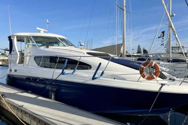 IN A SINGLE ASSET LLC!......Located at the Cabrillo Way Marina with a possible transferable slip and shortest distance to Catalina, "Reflections" is a versatile and stylish cruiser that blends comfort, performance, and practicality. With an overall length of 41.75 feet and powered by twin Cummins 480CE turbo diesels, this yacht offers strong performance with cruising speeds around 21 knots and top speeds near 30 knots, featuring a sleek modified Vee hull crafted from durable fiberglass, ensuring a smooth and stable ride on the water. A spacious interior features two private staterooms with ensuite heads, a well equipped galley and an inviting salon with abundant natural light. On deck, the 390MY boasts wide side decks, a roomy aft deck with hardtop, and a fully enclosed flybridge for year around comfort. Built with Sea Ray’s signature quality and outfitted for extended cruising, she is equally suited for weekend getaways to Catalina or long coastal adventures.