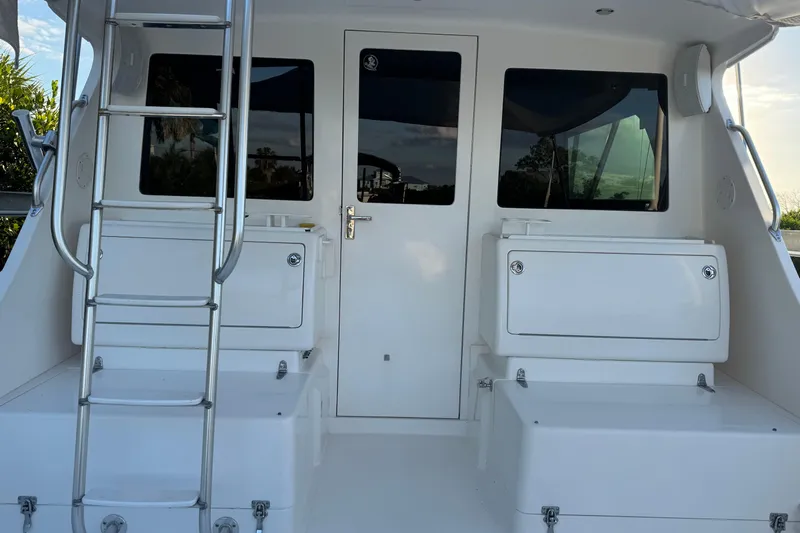 A spacious head with separate stall shower is aft to starboard. Two additional single berths are located portside in the guest cabin. The cockpit is 130 sq ft with 2 large fish boxes, equipped with macerators, and a 50-gal bait tank is located in the transom to save cockpit space. A tournament style flybridge features electronic controls, easy to read analog engine instrumentation, large console for electronics, Pompanette helm and companion seats plus a forward bench seat with storage below.
