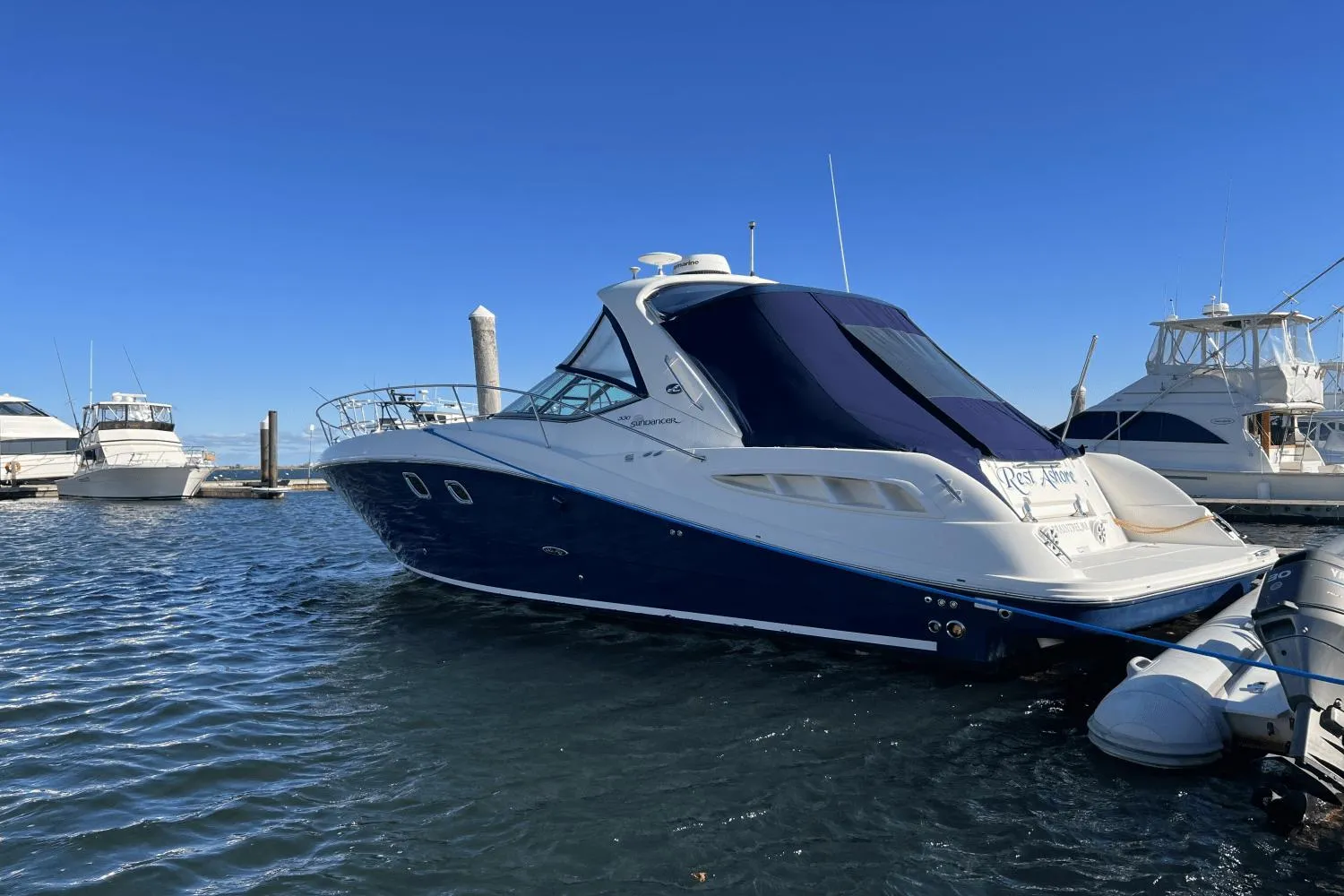 The 2008 Sea Ray SUNDANCER is the epitome of luxury and performance on the water. With sleek lines and a spacious layout, this boat is perfect for entertaining family and friends or enjoying a relaxing day on the water. Measuring at (insert length), this Sundancer model offers generous living space and amenities for ultimate comfort. Step aboard and be greeted by a well-appointed cockpit featuring plush seating, a wet bar, and a versatile sun lounge area. Whether you're enjoying a sunset cruise or hosting a barbeque, the Sundancer's cockpit is designed to cater to all your entertainment needs. Below deck, you'll find a lavish and elegant cabin that is a true home away from home. The open floor plan allows for plenty of natural light to fill the space, creating a warm and inviting atmosphere. The fully equipped galley offers modern appliances and ample storage, making meal preparations a breeze. The 2008 Sea Ray Sundancer is powered by (insert engine details), ensuring a smooth and exhilarating ride. With its sleek design, powerful performance, and luxurious features, this boat is the perfect choice for those who demand the best in boating. Experience the Sea Ray difference and make lasting memories on the water with the 2008 Sundancer.