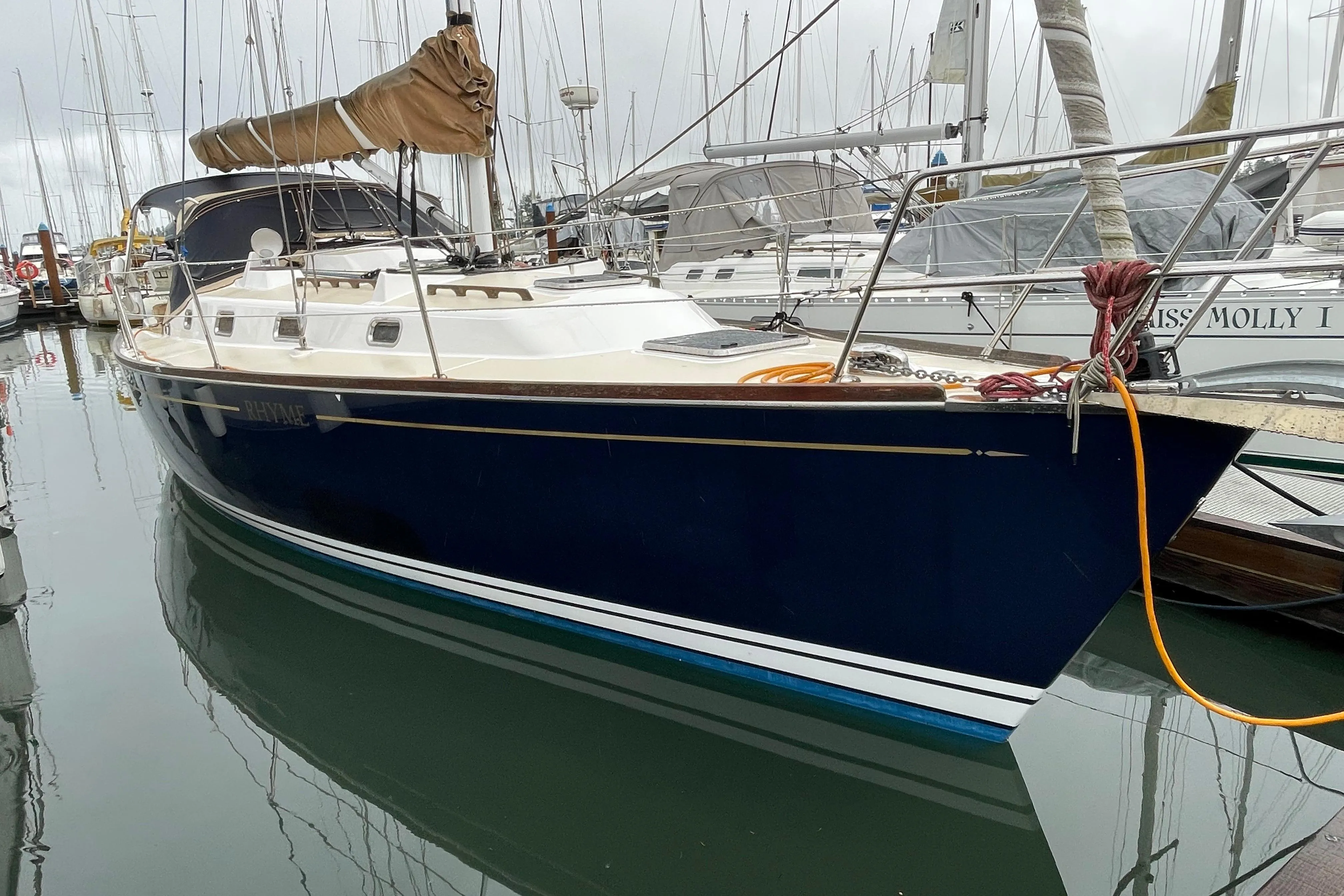 "Rhyme" is a fine example of the Tartan 3400. She has been well maintained and lightly used. She features a pristine interior with 2 cabins and 1 head layout. Rigging features a Carbon fiber mast with a pocket boom. Sails include a set of Ullman FiberPath sails plus a set of Dacron sails, plus 2 spinnakers. Electronics include Raymarine C90 plotter, radar, autopilot, AIS, wind/speed/depth instruments.
