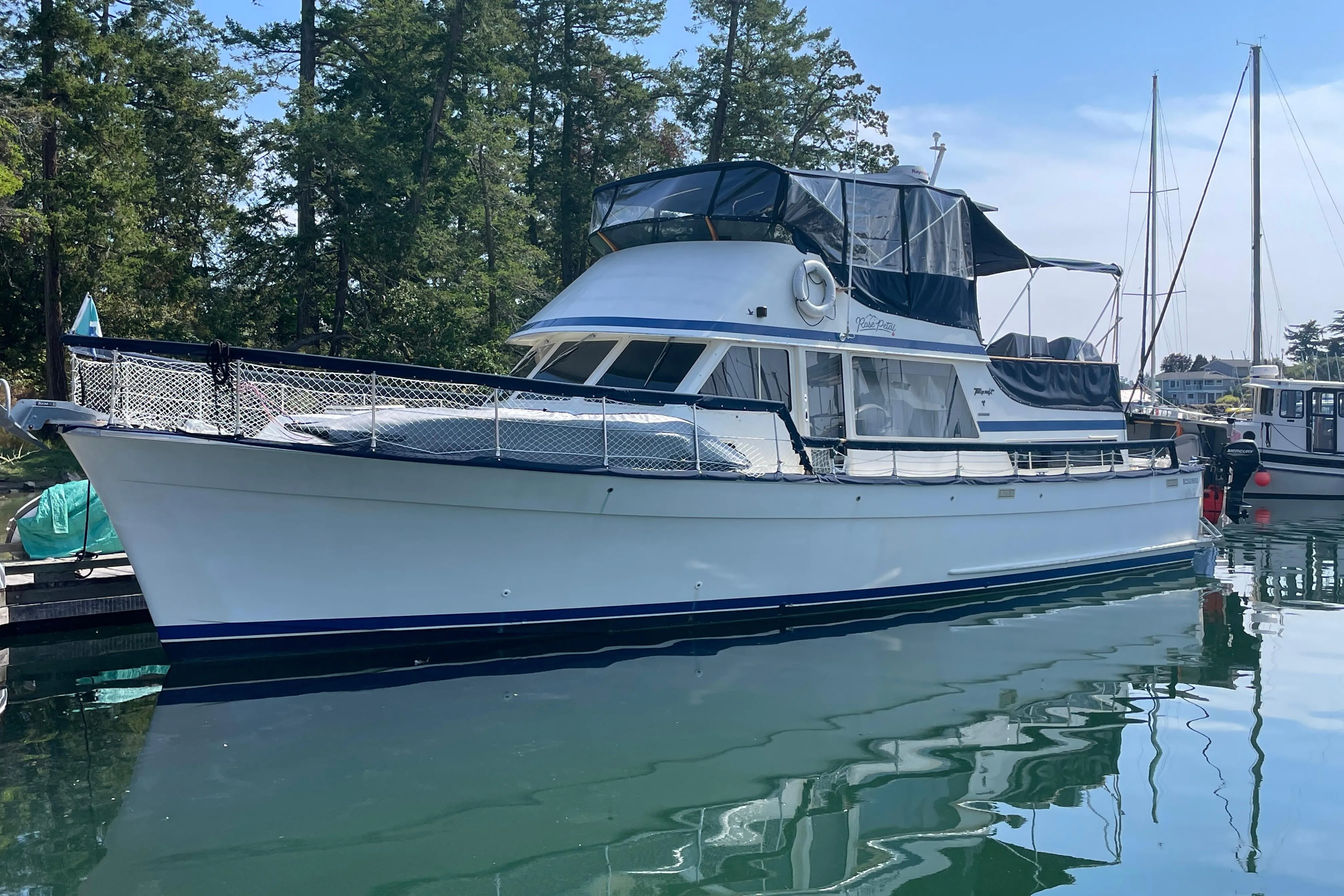 The 48’ Tollycraft Motoryacht is one of the most sought-after models in the Pacific Northwest — admired for its seaworthiness, timeless design, and comfort. Rose Petal has been lovingly restored and upgraded with over $150,000 invested in renovations and maintenance during the past four years. She’s a proven cruiser with modern comforts and pride of ownership evident in every detail. Also of note, is that Rose Petal's previous owners had Swanson rolling chocks fitted to improve stability and performance and all her cabin windows were replaced with the updated style.