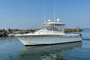 Introduced in 2001, the Grady-White 330 Express has long ranked among the best-selling express fishing boats of her era. A centerline helm offers excellent 360-degree visibility, and a wide 11'7" beam provides more cockpit and cabin space than most express boats in her class. Updates in 2008 include a raised cockpit floor and windshield for improved helm visibility and a beefed-up transom to handle the upgraded Yamaha F350 four-strokes. Note the pop-up electronics pod at the helm. Standard features include an integrated swim/dive platform, hardtop with radio box, 45-gallon livewell, foldaway rear bench seat, fresh/ raw-water washdowns, cockpit bolsters, transom door, aft-facing cockpit seats, lockable electronics cabinet, 4kw Fisher/Panda Generator, bait-rigging station with sink, transom fish box, and bow pulpit. Belowdecks, the attractive midcabin interior of the 330 Express sleeps four and includes teak cabinets, teak-and-holly sole, cherry dining table, full-service galley with microwave and Corian counter, and a roomy head/ shower.