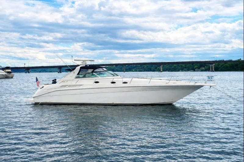 Introducing the stunning 1997 Sea Ray 450 Sundancer, a remarkable motor yacht that effortlessly combines elegance and performance. With an overall length of 45 feet, this vessel boasts a sleek fiberglass hull designed in a deep vee shape, ensuring a smooth and stable ride on the water.