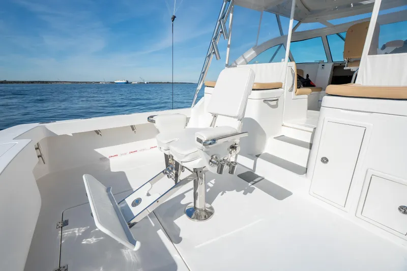 The helm deck features a rod locker, Helm Air reverse-cycle A/C, and comfortable seating for extended runs. The cockpit is tournament-ready with a fighting chair, transom fish box, large in-deck fish box, tackle center, bait freezer, and port-side livewell — designed for serious offshore anglers.