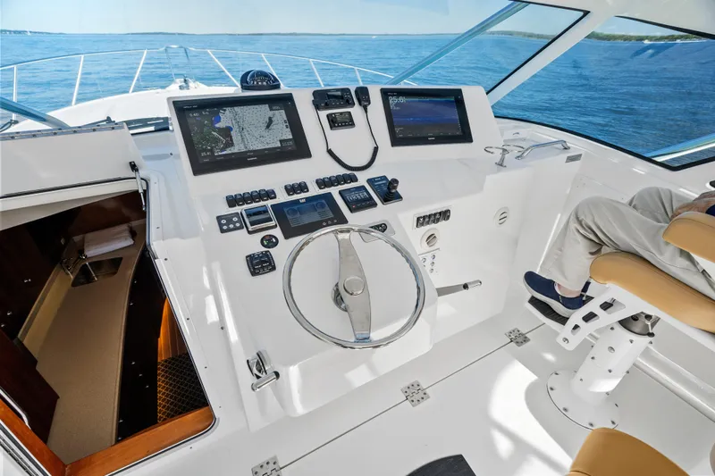 Her Pipewelders tower with full controls and Optimus steering provides excellent visibility and precision handling. The Palm Beach–style helm controls and full Garmin electronics suite make navigation effortless, including: