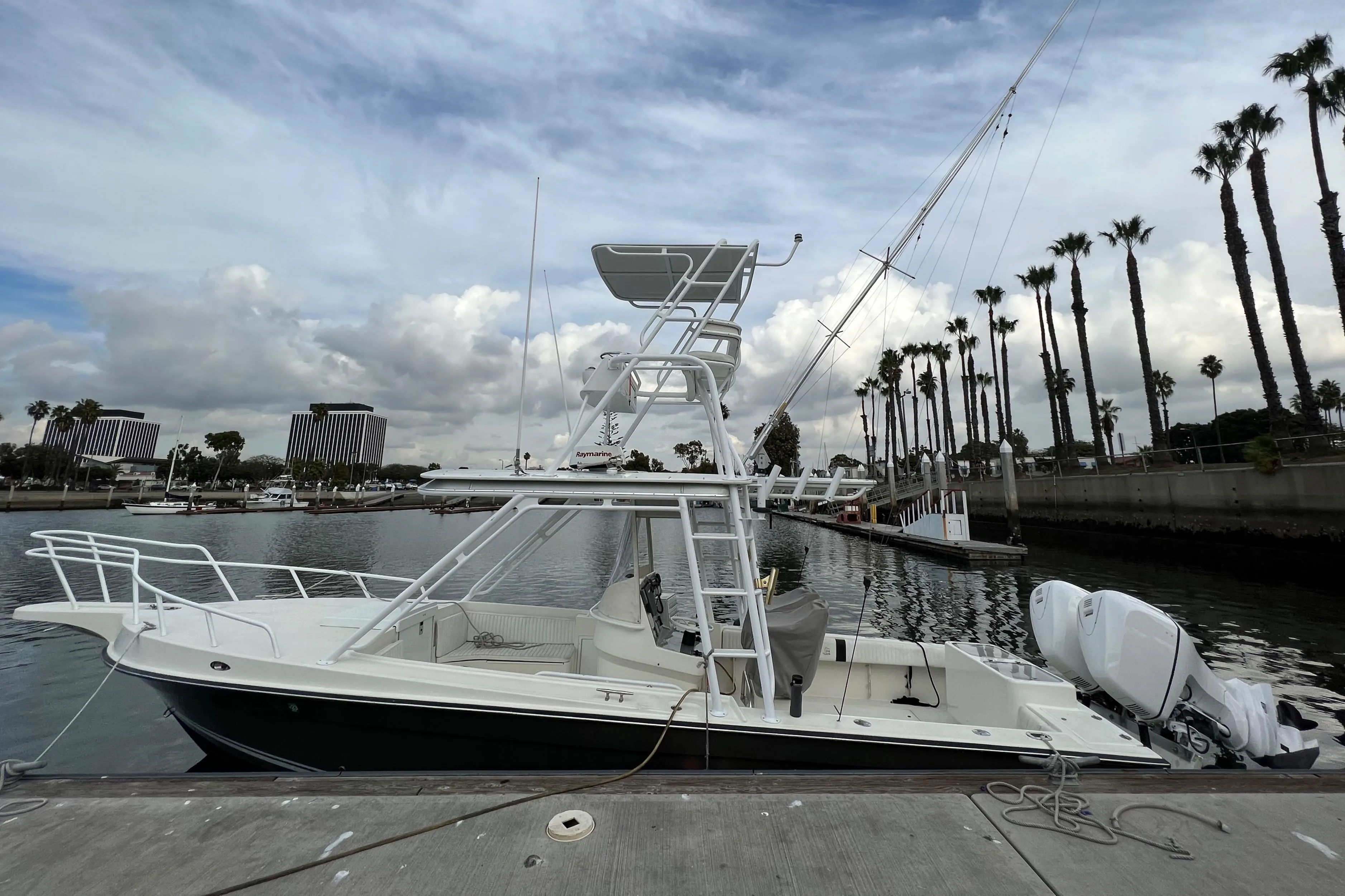 This 300 custom edition is ideal for fishing offshore. She comes with a tuna tower with helm controls, bait tanks, fish boxes, and outriggers. The boat is also ready for overnight trips to the islands with a small cuddy cabin and head in the bow.
