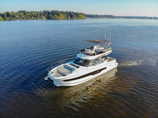 This boat is a stunning example of Jeanneau’s flagship outboard flybridge model — the NC 1295 Fly. This 2024 model is barely broken in with just 68 hours on her engines, she combines sophisticated European design with efficient, quiet performance. Her triple Yamaha 300s deliver a comfortable 24–28 knot cruise and top speeds around 38 knots.
