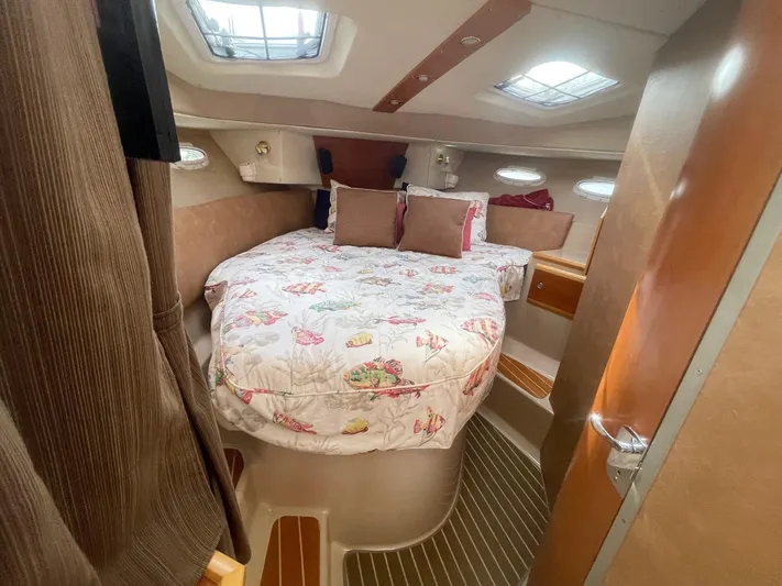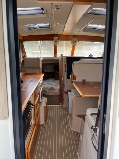 Inside, the layout is thoughtfully designed to maximize comfort and functionality. The bright salon features panoramic windows, a convertible dinette, and a fully equipped galley with a propane stove, oven, and refrigerator/freezer combo—perfect for entertaining or preparing meals on the go. The forward stateroom offers a cozy queen berth, while the mid-cabin converts to additional sleeping space, accommodating up to six guests with ease.