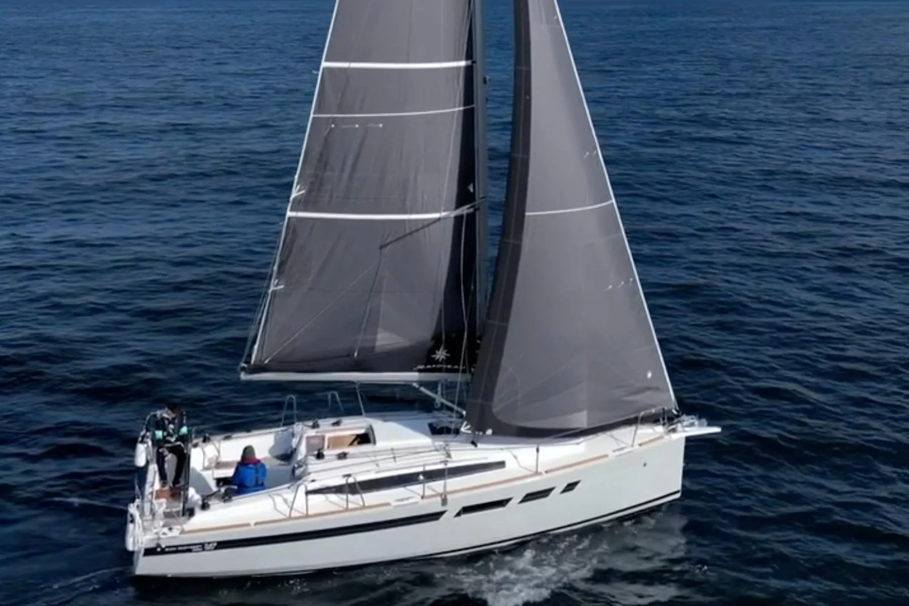 The Jeanneau 349 is a hard chined hull performance cruiser with twin wheel cockpit, drop down transom, twin rudders, easy to handle sail plan and much more! Loads of interior space with a bright, light open interior.  6'4" headroom, master cabin forward with "French doors", large aft cabin to starboard.  2 cabin,1 head arrangement with large head & completely separate shower!!  Huge storage garage aft with access from cockpit & large door aft of shower!!  All of this in a 35' modern sailing boat!!