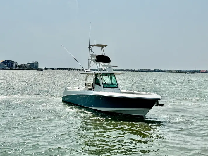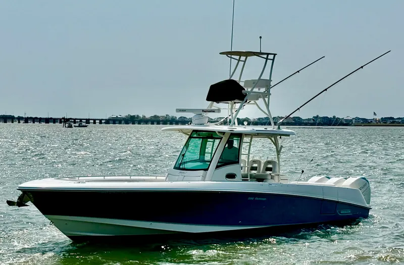 Sea W is a 2014 35' Boston Whaler 350 with Tower and Sunshade. The Tower features a bench seat and Tower controls with Raymarine electronics in Upper Station. The lower helm has three bolstered seats, full windshield and enclosure along with a full Raymarine eletronics package. In front of the Console is a lounge seat, in front of that lounge is forward seating with a table in the bow area. This is a great all purpose boat, fish offshore on Saturday and hit the Sandbar on Sunday. The Cockpit has two doors - One in the transom and a dive door on the port side, both have designated ladders. The transom bench seat folds up and out of the way while fishing. The Release Marine Battle Saddle adds to the offshore fishing capabilities of this 35 Outrage. Powered by triple Mercury 300's with 975 hours.