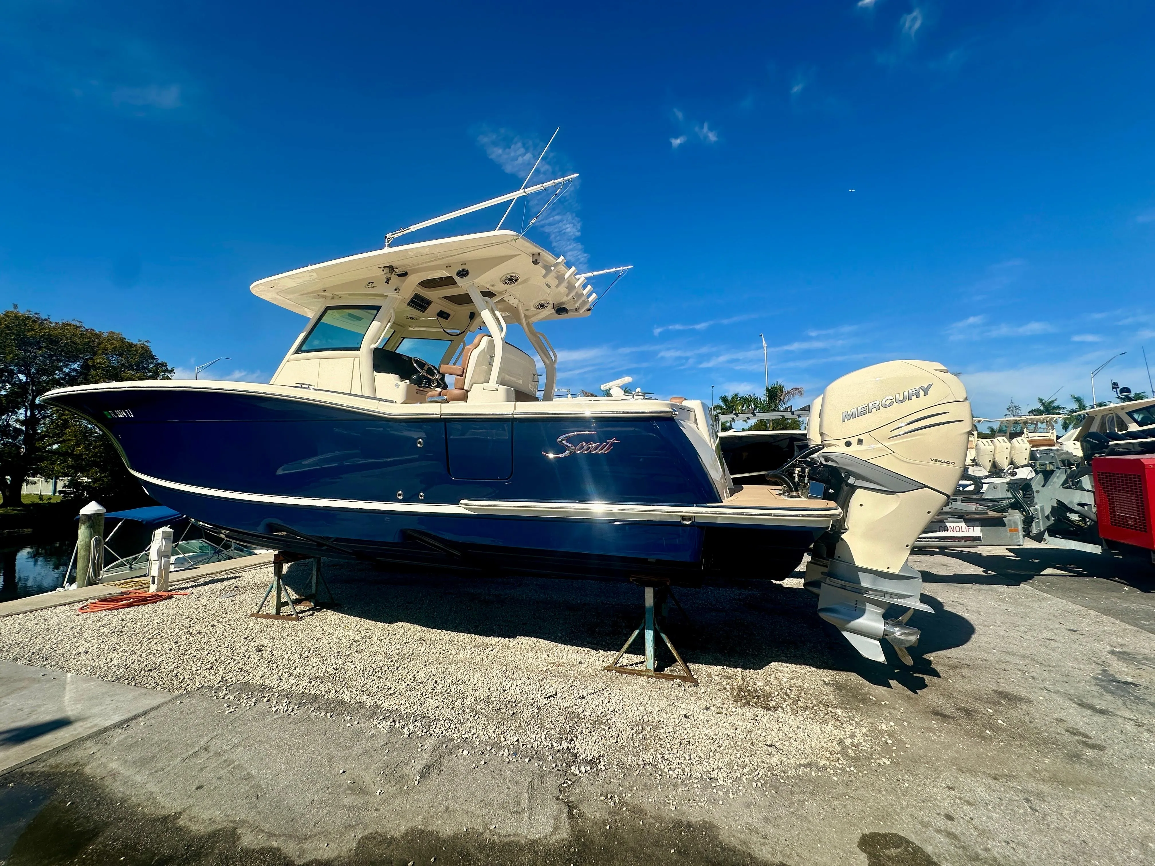 2023 Scout 330 LXF powered with Mercury (2) 350XXL Verado's w/ Joystick/Skyhook (Incl Autopilot/Active Trim), approx. 162 hours, with Mercury Platinum Warranty to 10/03/27, Custom Engine Color: Pearl Fusion, Midnight Blue Full Hull Color, Scout White Painted Accent Stripe, (2) Garmin 8616, B175H Transducer, Garmin VHF 115, Deluxe Stereo Upgrade (6) 7.7" JL Speakers (2) 10" Subs (2) JL Amps, Bow Thruster, Miscela Cushion Package, Forward Deck Shade Canvas, 60/40 Helm Seat, Upgraded Leaning Post w/ Aft Facing Seat & Cooler/Storage Box, Retractable Rocket Launchers, Electric Fiberglass Cockpit Sun Shade, Outriggers (Cranking w/ 18' Poles), Edson Steering Wheel, 12V Air Conditioning, Electric Fwd Esthec Dinette Table/Conversion Sun Lounge, (2) Krystal Electric Plugs, Full Boat Cover, Engine Covers (2),