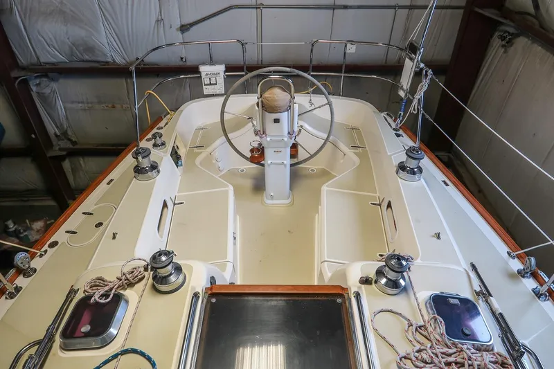 - Flush deck forepeak locker with divider for anchor rode and storage for fenders and lines