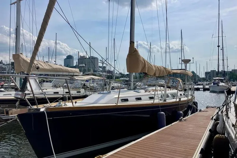 The current owner updated the vessel in 2025 with a refinished varnished interior, new Genco dodger, bimini, and mainsail covers.
