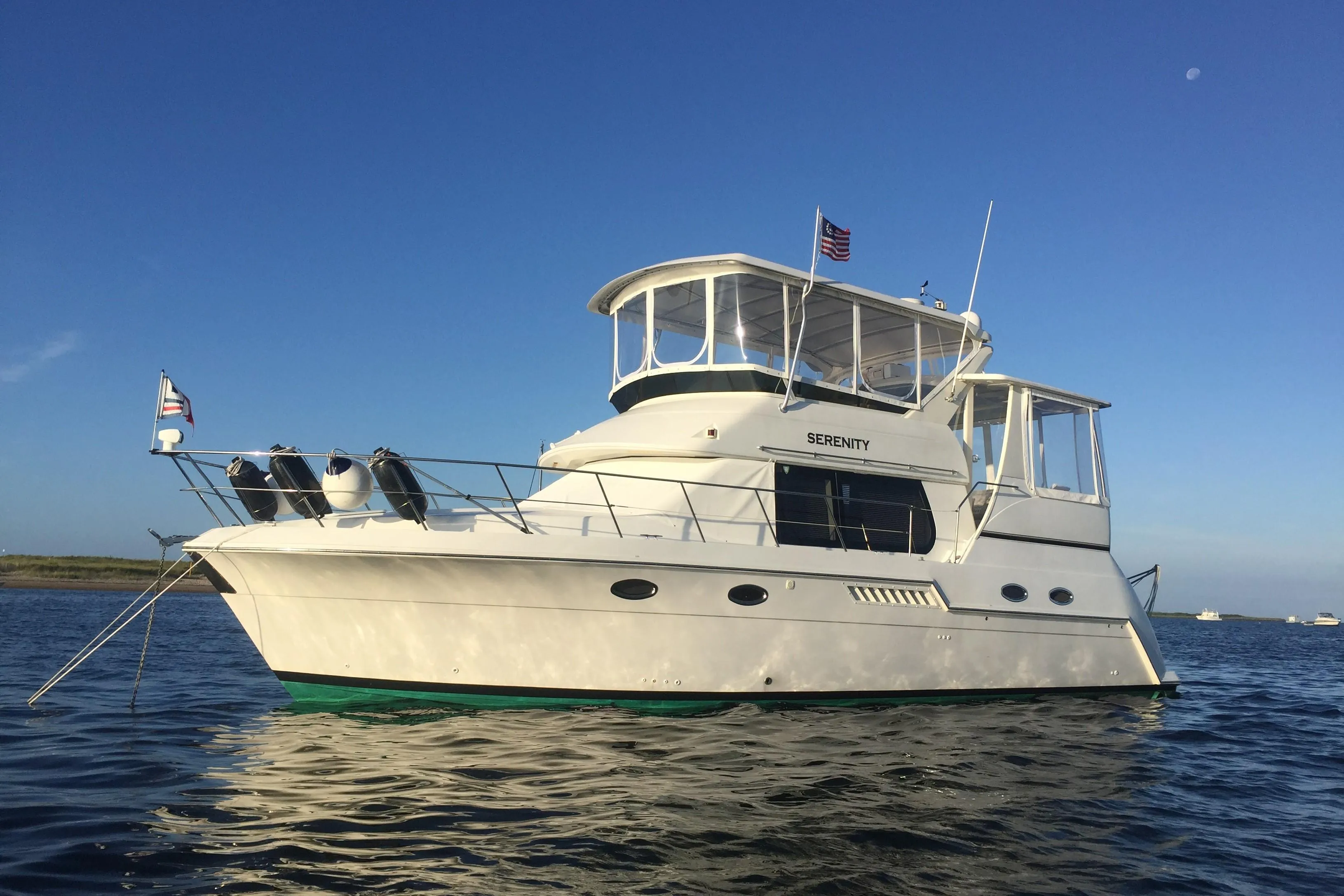 Clean and comfortable, this Carver 406 Aft Cabin Motor Yacht is built on a deep V hull and has a spacious salon, with a galley down layout and a separate dinette. Also included are two accommodating staterooms, with two heads: one day/guest head and one primary en-suite. Cruise her for weeks at a time as there is no lack of interior volume on SERENTIY. The interior woodwork is a light maple stain and the large wraparound salon windows make the space bright and cheerful. She has a fully enclose-able, spacious flybridge with a custom hardtop and a roomy aft deck with molded steps down to the swim platform- no ladder involved! Serenity's experienced owners have maintained her well and have added several desirable upgrades which include a bow thruster, dinghy davits, hardtop, inverter, solar panels, and much more. Twin 330hp Cummins diesel engines (2200 hrs) provide a 15 knot cruise speed. Serenity is truly in outstanding condition! Don't miss this exceptional, well equipped mid-size motor yacht!