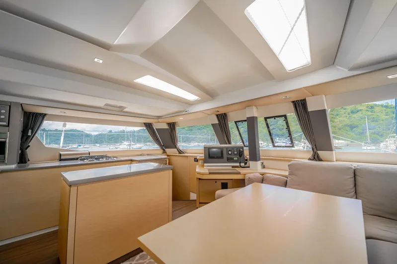 Depuis lors, ce modèle continue de recevoir des éloges critiques à travers le monde pour ses lignes distinctives, son style sophistiqué, ses espaces de vie spacieux et ses performances exceptionnelles en mer. Les propriétaires adorent le mouvement et la communication sans couture entre le cockpit, la station de barre et le pont salon, tandis que l'incroyable espace dans le salon évoque l'ambiance de vue à 360 degrés traditionnellement trouvée uniquement sur des yachts beaucoup plus grands. Le design du Saba 50, grâce à l'équipe d'architectes navals, est le plus grand catamaran Fp qui peut vraiment être manœuvré seul depuis sa station de barre unique. Un design élégant et innovant, le yacht à voile Saba 50 attire tous les regards où qu'il aille. En navigation, SERENITY a fière allure à l'ancre, surtout la nuit avec son éclairage de pont bleu et ses lumières sous-marines.
