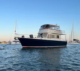 Introduced in 2006 the Mainship 43 Trawler remained the flagship of Mainship's fleet until 2012. The 43's semi-displacement hull allows this trawler to cruise with the efficiency of trawler or sprint to your destination with the speed of a modern express. The two-stateroom interior of the  Mainship 43 includes a double bed in the guest cabin as well as a second head. It also features a step-down galley forward of the salon and a massive queen island bed in the master stateroom. With a broad 15'6" beam this allows for an expansive salon as well as wide side decks for comfort and safety. With its massive 777-gallon fuel capacity, this Mainship 43 can get you anywhere while cruising at 18 knots.
