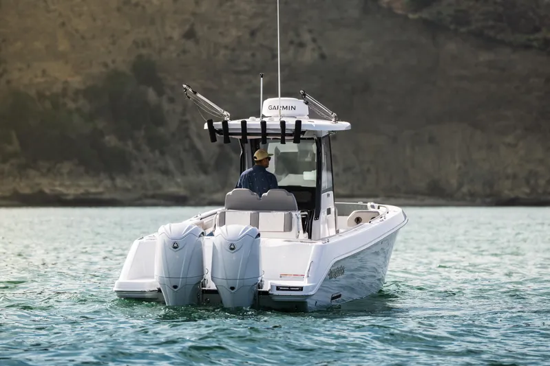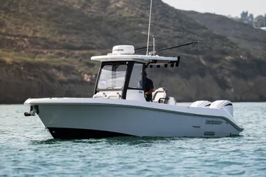The 285cc’s timeless exterior design, rich accents, and fish-fighting posture are recognizable from any distance. Its spacious bow features plush upholstered lounges with teak accents and recessed in deck storage that quickly converts into an immense casting deck or spacious sun pad. An advanced helm station provides complete control with dual Garmin displays and proprietary digital switching. The aft offers versatility no other fishing boat can boast, with an exclusive rotating helm / mezzanine seat and loads of fish-focused storage. From genteel evening cruises to impassioned offshore excursions, the 285cc sets new standards in comfort and performance.