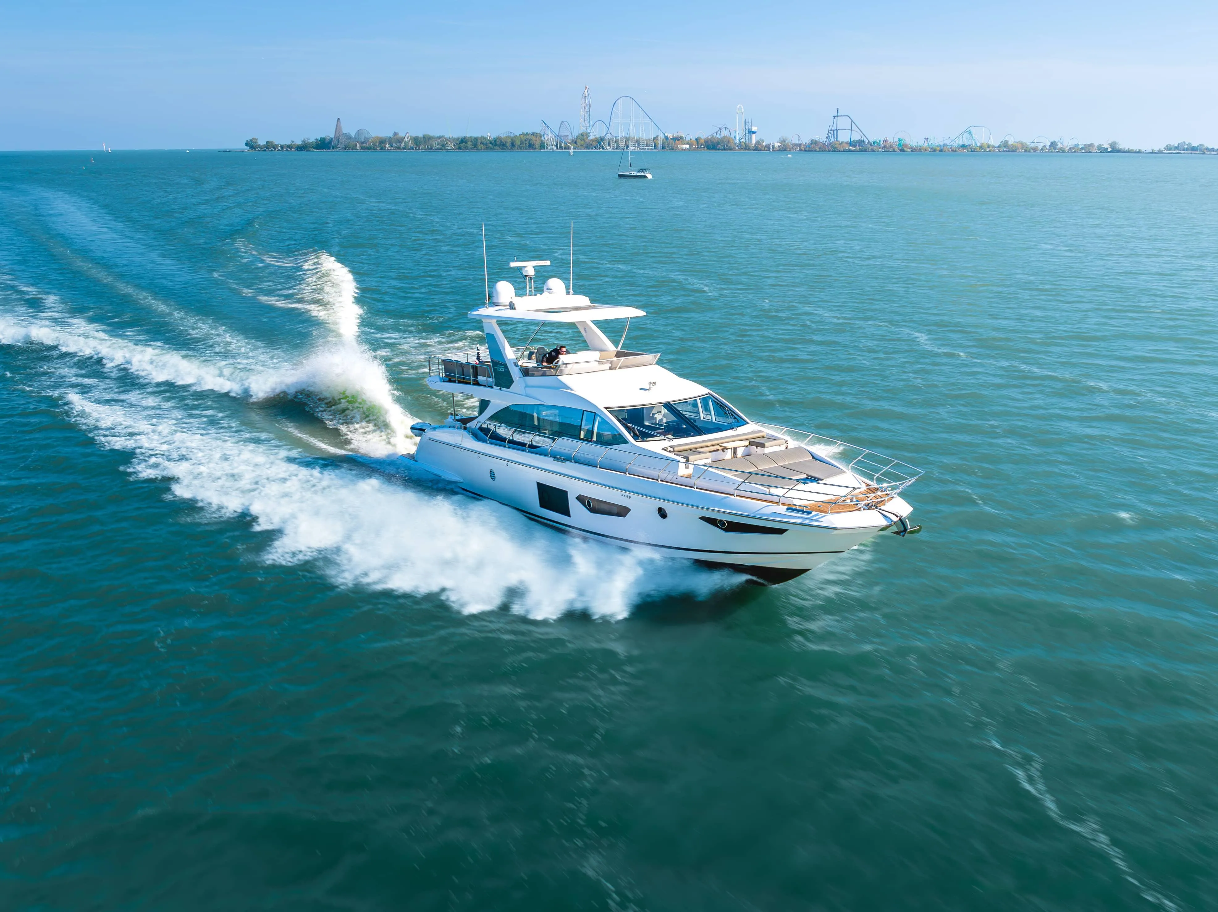 Ample seating in the Cockpit, Flybridge, Salon, and Bow allow for entertaining, sunbathing and relaxing from multiple points onboard, while also providing shade with the electrically actuated canopy on the bow and electronic retractable soft top on the flybridge.