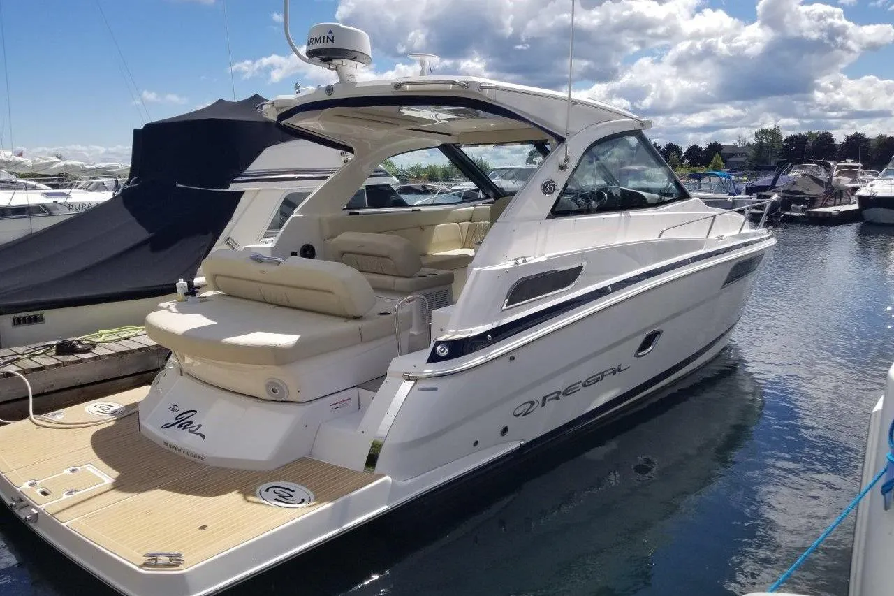 Regal's most popular sport yacht of all time, the 35 Sport Coupe literally defined the genre. This beautiful 2018 Regal 35 Sport Coupe is a local, freshwater boat sold new by Crate's and maintained in great condition. What really stands out is the incredibly low 241 engine hours. Finished in classic white with blue bootstripe, the look is classy and timeless. Her long list of standard and optional equipment includes cabin and cockpit heat and AC, Westerbeke 6.5KW generator, all-chain windlass, Garmin GPS chart plotter, Garmin radar, Garmin VHF radio, cockpit fridge, cockpit icemaker, electric cockpit grill, power sliding sunroof with walk-through windshield, massive aft cockpit seat/transom sun lounge with electric slide, extended swim platform with Flexiteek, dark walnut cabinetry, and so much more. This one is virtually turn-key and a pleasure to show!