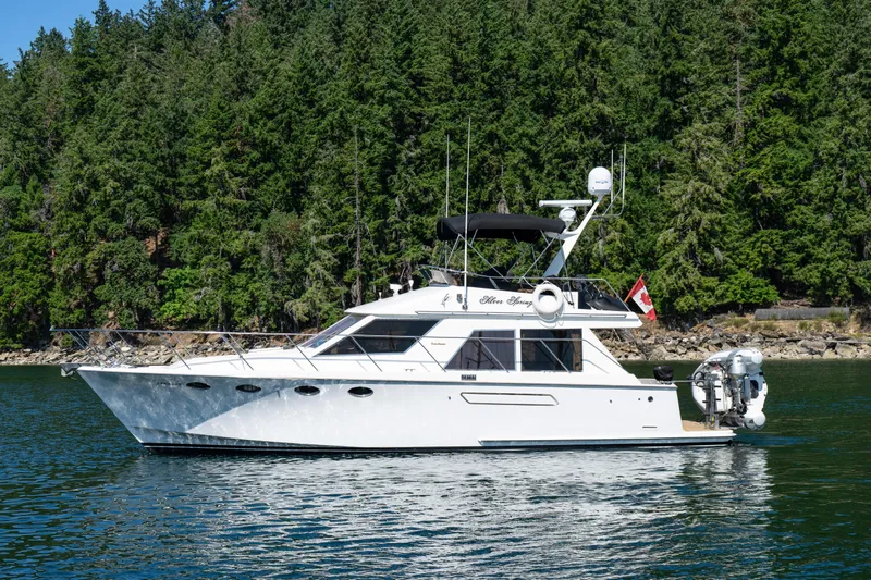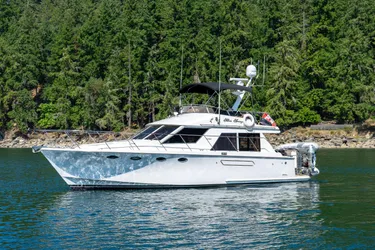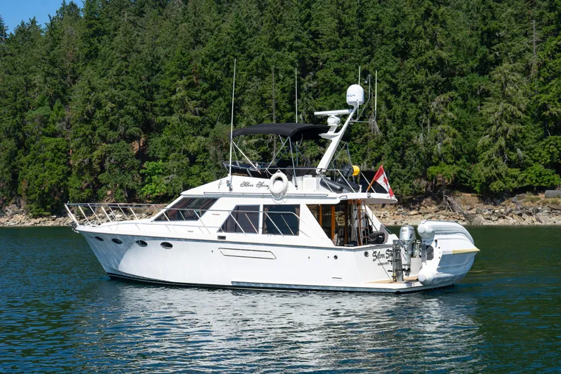 Come aboard the 39/42' “Silver Spring” - Rare, Clean, & Fantastic Condition....tremendous upgrades including diesel CAT's re-power, genset, custom 3 ft. hull/ swim step extension, power folding arch, with SeaWise davit and deluxe Novurania tender package!