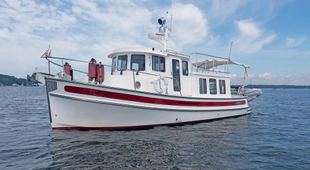 The Nordic Tug 32 is the perfect yacht for the cruising couple, yet she sleeps 2 couples easily and comfortably. She handles like a dream and is ideal for tucking into shallow coves and small intimate docks. Don't let her size fool you because she has every amenity and is as tough and seaworthy as her larger siblings. Like all Nordic Tugs she features a semi-displacement hull with hard chine for greater speed and sea keeping qualities, a fine entry bow for a quiet ride and better fuel efficiency and is built with pride in the USA. Her large ship-style pilothouse with panoramic 360 degree views, direct access to the deck, and standard bow thruster makes handling and docking in close quarters a breeze. The standard 280hp electronic diesel engine provides cruise speeds in the teens with incredible efficiency. A roomy salon/galley is equipped with "L" settee that coverts into a double berth and forward you will find a spacious stateroom and large head with shower. We call her a 32, but she?s really 34' 7" of comfort and confidence!