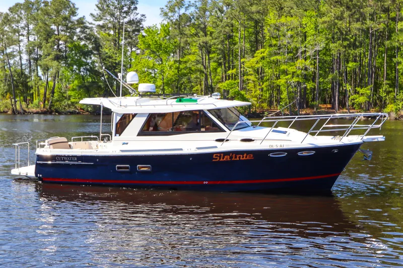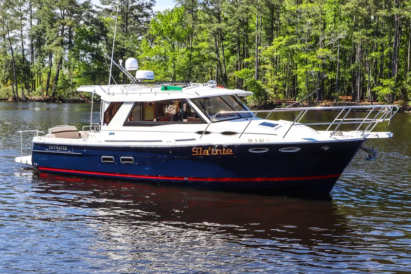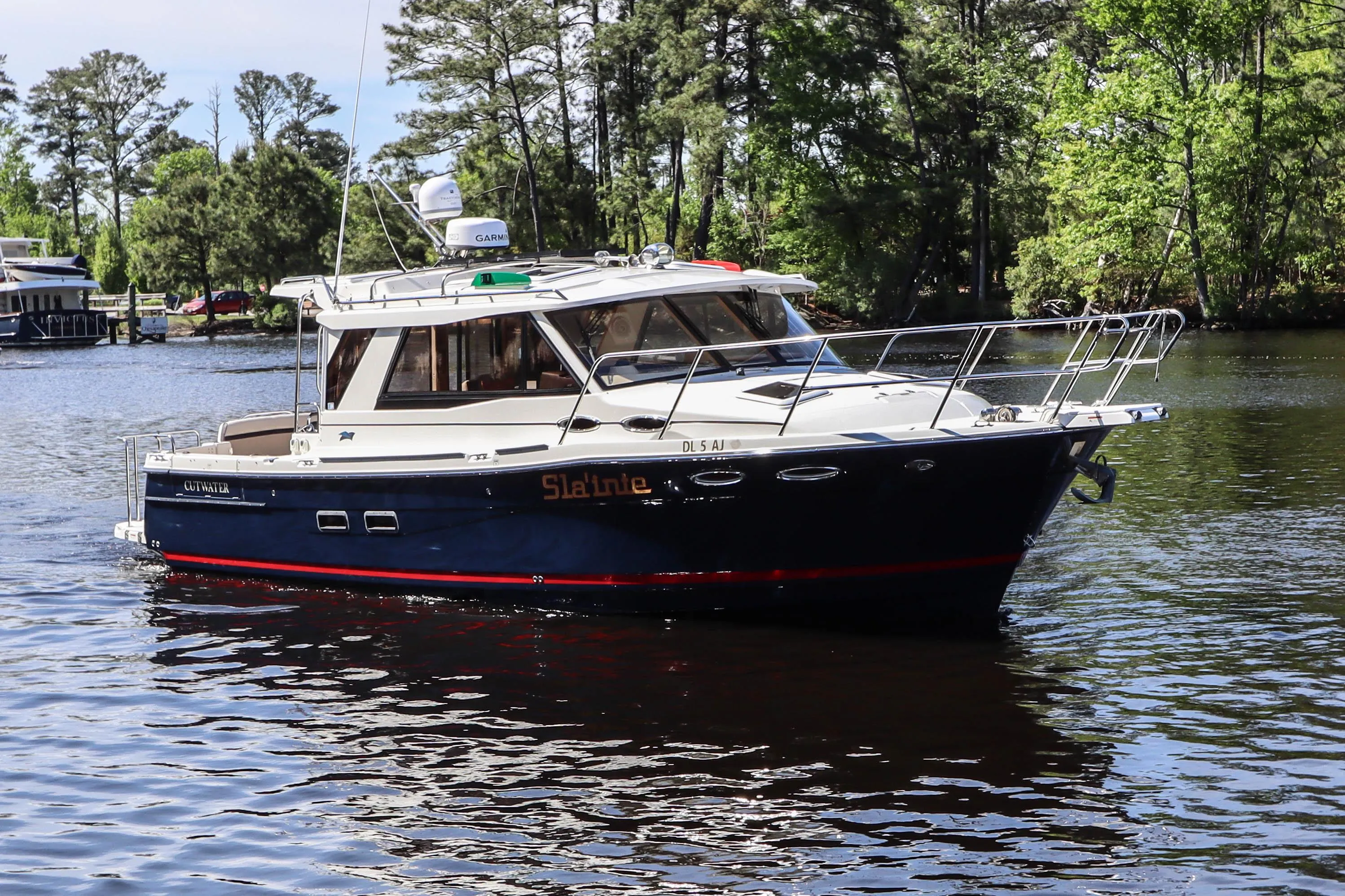 Beautiful utilitarian sedan cruiser with all the features expected of a larger vessel. The single engine, skeg keel, modified-v hull is easy to handle with the power of the 370hp Volvo D6 and Side-Power bow and stern thrusters. Single cabin with double berth, ensuite head, full galley, converting dinette, and secondary berth/storage compartment underneath. Spacious cockpit with adjustable bench seating port and starboard, and additional helm station. EZ Loader Triple axle float on trailer.