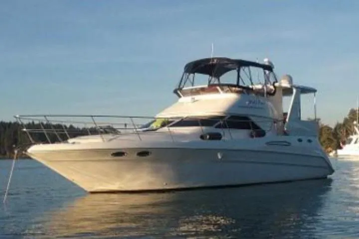 The Sea Ray 420 Aft Cabin has three comfortable staterooms, ample walkways, and a cockpit that can accommodate a host of guests with ease. Below, the wide-open cabin allows passengers to enjoy a sumptuous interior noted for its quietness thanks to Sea Ray's patented underwater exhaust system, which reduces engine noise significantly while underway. An L-shaped salon sofa with pull-out ottomans provides a relaxing atmosphere for listening to the standard Clarion AM-FM digital cassette stereo with a six-disc CD changer and six speakers, or enjoying the TV - VCR - radio combination. There's also a convenient raised L-shaped dinette with room for four (and this can be replaced by an optional lower control station). Rich wood finishes complement the fully equipped galley, which features a flush-mounted three-burner electric stove, a microwave, refrigerator with freezer, sink, custom-molded countertop with new Corian covers, and a tremendous amount of storage space above and below. A Spacemaker coffee maker also comes standard on the 420 Aft Cabin. The staterooms are lavish, from the aft master stateroom with queen-size bed and innerspring mattress, abundant storage, and full master head with shower; to the forward stateroom V-berth with full-size pedestal bed and plenty of built-ins. Both of these staterooms feature a standard entertainment center with TV - VCR - radio combination. The 420 Aft Cabin also has a port stateroom with twin beds for additional sleeping and storage space, or it can be replaced by an optional, fully equipped laundry room for more “at-home” comfort. Above, passengers can congregate on the roomy aft deck of the Sea Ray 420 Aft Cabin in any weather because it's protected by a fiberglass hardtop, custom fiberglass skirts, and acrylic entrance doors to port and starboard. The smooth, clean profile means there are no steps to the foredeck. A transom door allows easy access to the swim platform where there's an oversized storage compartment with gas-assisted hatch and automatic sump pump. The forward-mounted bridge helm affords the captain better visibility forward and aft, while guests have a wide open space to enjoy the bar and Clarion AM-FM digital cassette stereo with its six-disc CD changer, subwoofer, four speakers, all remotely controlled from the cockpit. The seating arrangement includes two custom slide and swivel helm seats, an aft-facing sun lounger and a bench seat. Courtesy lights, snap-in carpet, and beverage holders are also part of the appealing setting. The 420 Aft Cabin also includes a wealth of standard systems like the digital LCD systems monitor, remote start generator, Raytheon electronics, anchor washdown hookup, portside storage concealing a dedicated shore power inlet and much, much more. Powerful twin gas 454 Mag MPI Horizon MerCruiser inboards (T-380 hp - 283 kW) with freshwater cooling combined with a 350-gallon fuel capacity make sure the 420 Aft Cabin can go anywhere with absolute confidence, even in big water.