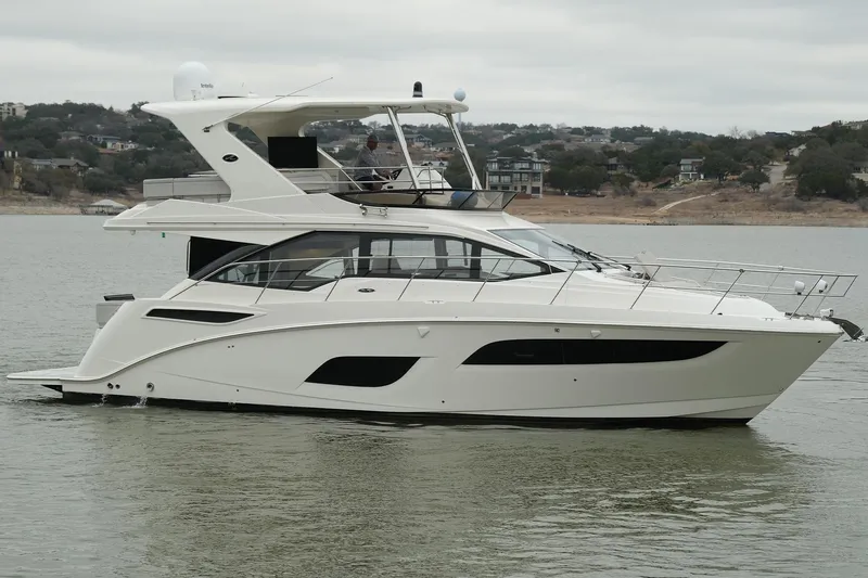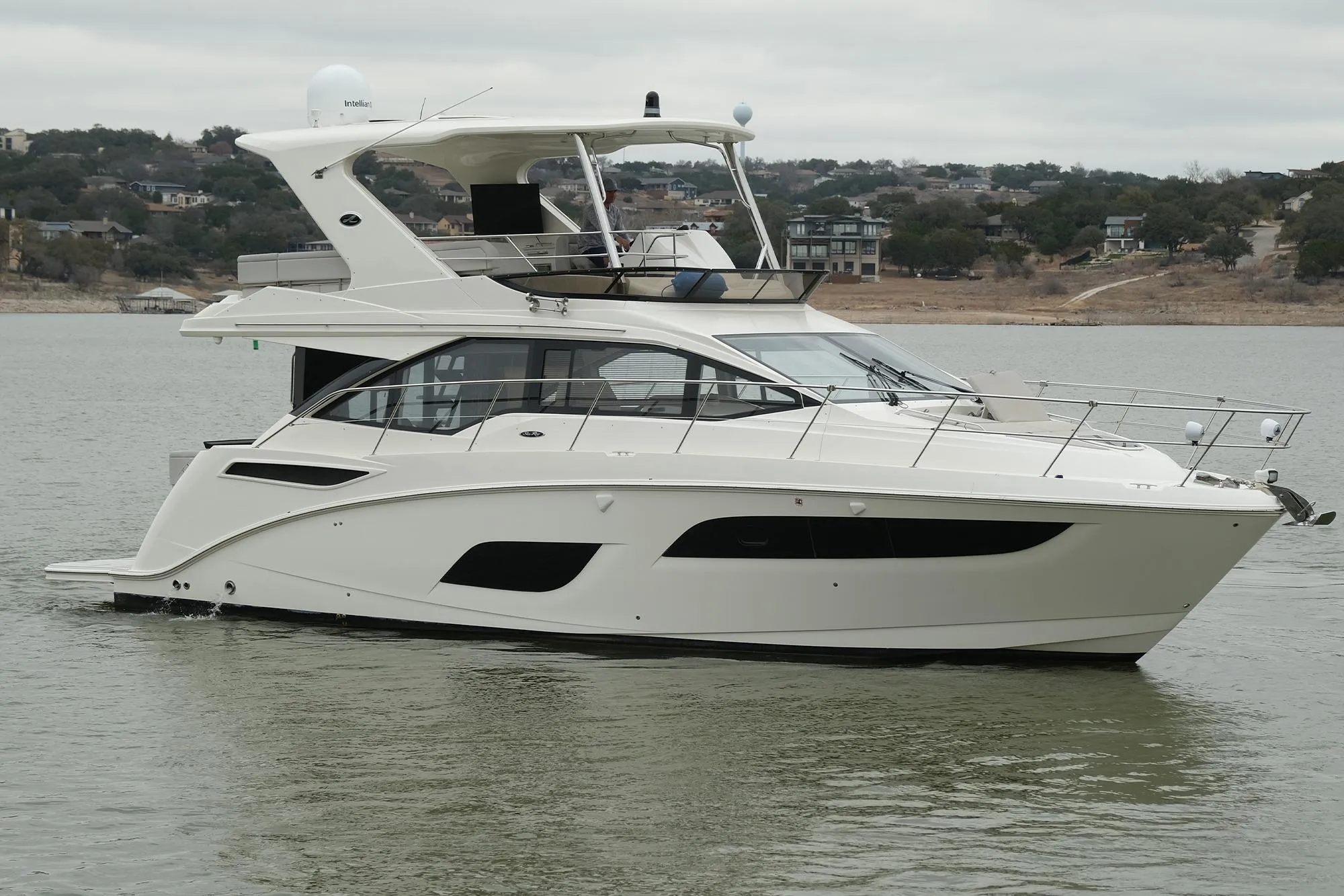 The Fly 460 represents a new era in comfort, entertaining capability and performance. This stylish sport yacht makes its presence known with Sea Ray's iconic lines and a sleek, modern aesthetic. The expanded flybridge's social layout invites long afternoons with loved ones, and an available flybridge enclosure with A/C and heat lets you continue the fun no matter the weather. And in terms of performance, count on the standard Cummins V-drives or available Zeus propulsion system with joystick control and integrated autopilot for confident command and exhilarating cruising.