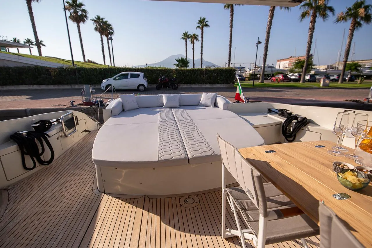 Questa barca è famosa per l'utilizzo che se ne può fare, ha uno strabiliante prendisole di poppa ma non manca un tavolo per il pranzo e la cena all'esterno ed una panca che su questa unità è stata fatta nel 2025 su misura più comoda e sopratutto con la possibilità di stivarci le cose all'interno.
