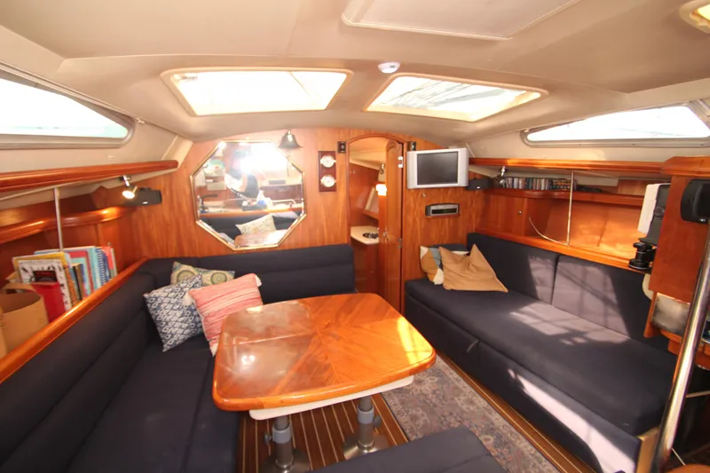 A well-designed L-shaped galley optimized for offshore cooking and storage is located port of the companionway.