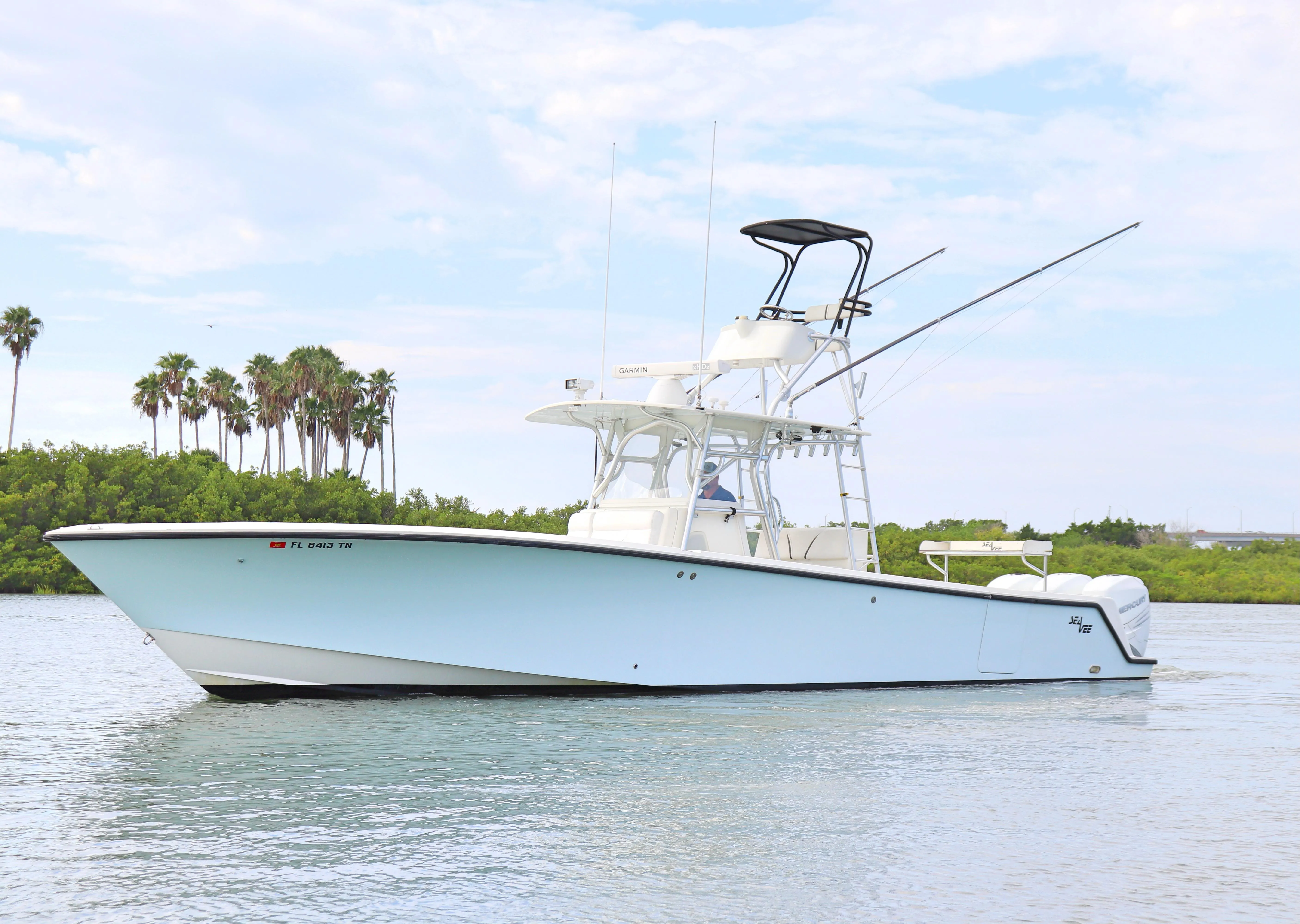 Available now is this beautiful SeaVee 390B powered by triple 2017 Mercury 350 Verados.  This boat is equipped with a collapsable tower including controls.   Plenty of in deck storage as well as insulated fish boxes forward and aft.  The 65 gallon transom live well is plenty big for all of your live bait needs.  There are 20 rod holders around the gunnels with an additional 23 rod holders located on the console, leaning post and tower.  Electronics include two 16' Garmin units at the lower helm and a 10" screen on tower.  Garmin auto pilot, 12kw Garmin radar, Fusion Radio with a 10 speaker JL Audio system are just some of the features this SeaVee is equipped with.  The console has a head with a sink as well as plenty of room for dry storage.  With a 540 gallon fuel capacity you will be able to chase down that next trophy fish or cruise the islands of the Bahamas.  Major Price enhancement!  Ready to make a deal.