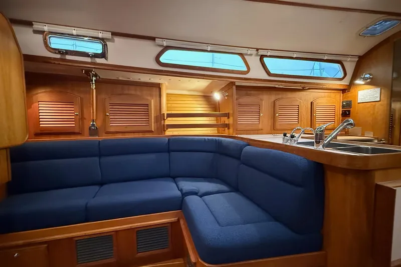 This fully loaded, showroom condition beauty has a layout which maximizes every inch of available space. With 6'4" headroom, "She sleeps 7. There are two separate cabins, one fore and one aft, allowing two couples or a family with children plenty of privacy. Both cabins have a seat and a good sized cedar hanging locker and lots of storage space. The main salon has settee/berths both port and starboard and a teak and holly cabin sole. The full width teak dining table folds up against the bulkhead when not in use. The chart table at the end of the port settee has plenty of room for recessed navigational equipment. The aft head compartment is quite large, includes a corian counter and a separate shower stall. The interior joinerwork is varnished cherry and is of the highest quality with all rounded corners. Top quality fit and finish is everywhere you look from the light fixtures to the hardware, right down to the beautifully varnished cabin sole. The owner's stateroom features a large vee-berth, and a vanity sink with wood framed mirror and upholstered seat. To port is a large cedar lined hanging closet. A deck hatch and two opening ports provide light and air to this comfortable space. Her spacious private aft cabin provides a comfortable space beneath the yacht's cockpit sole. Storage spaces are found here for all the gear that you and your crew have brought along. A cedar-lined hanging locker is also in the aft cabin. Main salon and cabins are upholtered "Sebago" with corian head "Everest". Convenient engine access.