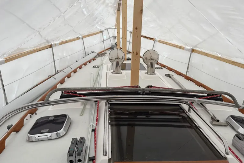The rig is a double spreader Hall spar with a Harken furler up front. There is a solid vang to control mainsail twist and a hydraulic split backstay to adjust headstay tension. All of the controls are well organized and led aft. The auxiliary power is a Westerbeke 35B.