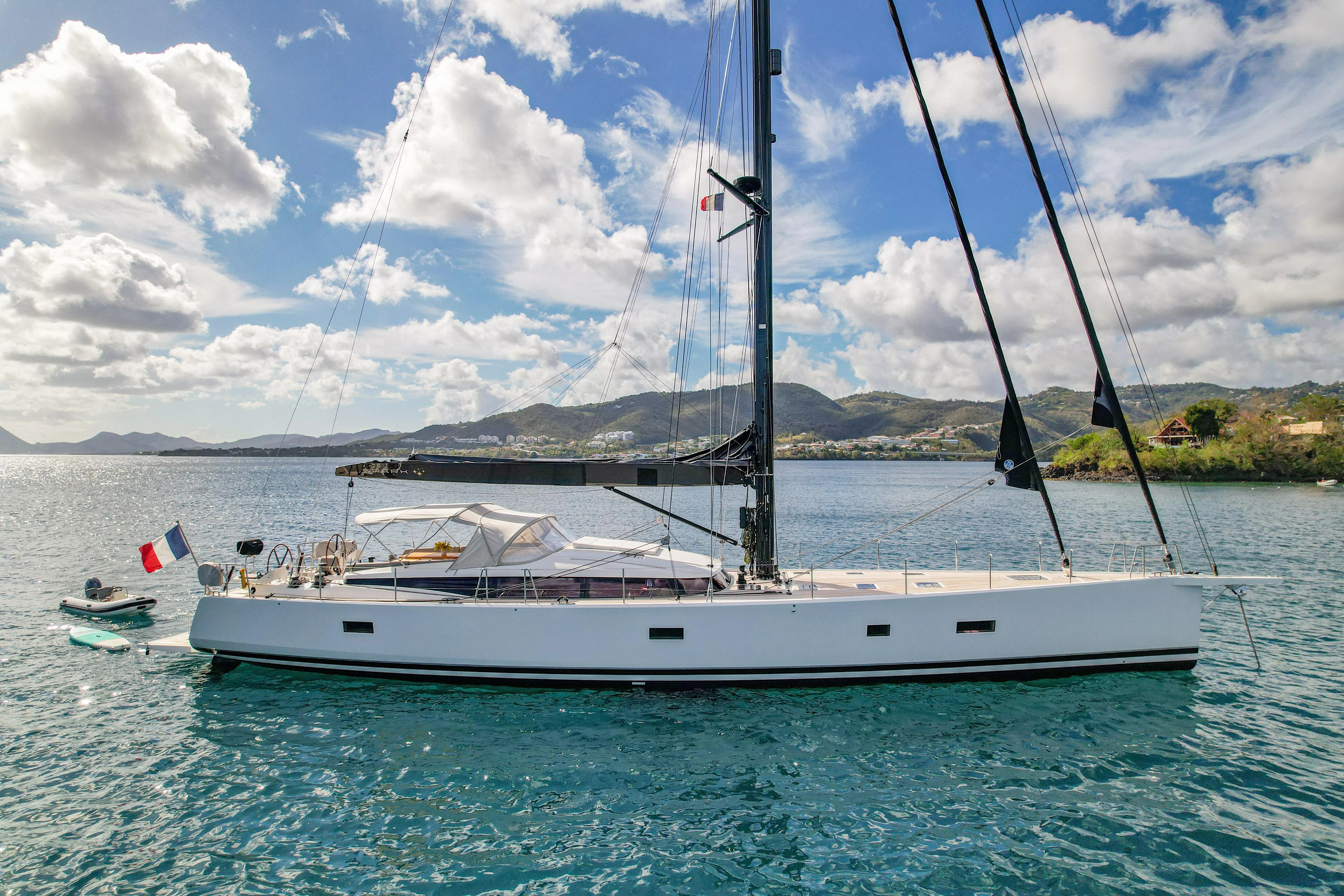 Very highly specified example, including performance carbon mast, carbon rod-rigging and V-boom with slab reefing and 3DI North Sails Ocean pack. Reckmann genoa and staysail hydraulic furlers, upgraded Harken winch pack, hydraulic passerelle, carbon & teak steering wheels and bulb keel with 3m draft.